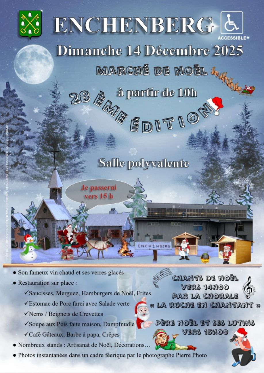 *28ème édition du marché de Noël d’Enchenberg ce dimanche de 10h à 19h. Une quarantaine d’artisans et producteurs locaux proposeront leurs produits. Le père Noël et ses lutins seront présents dès 15h.