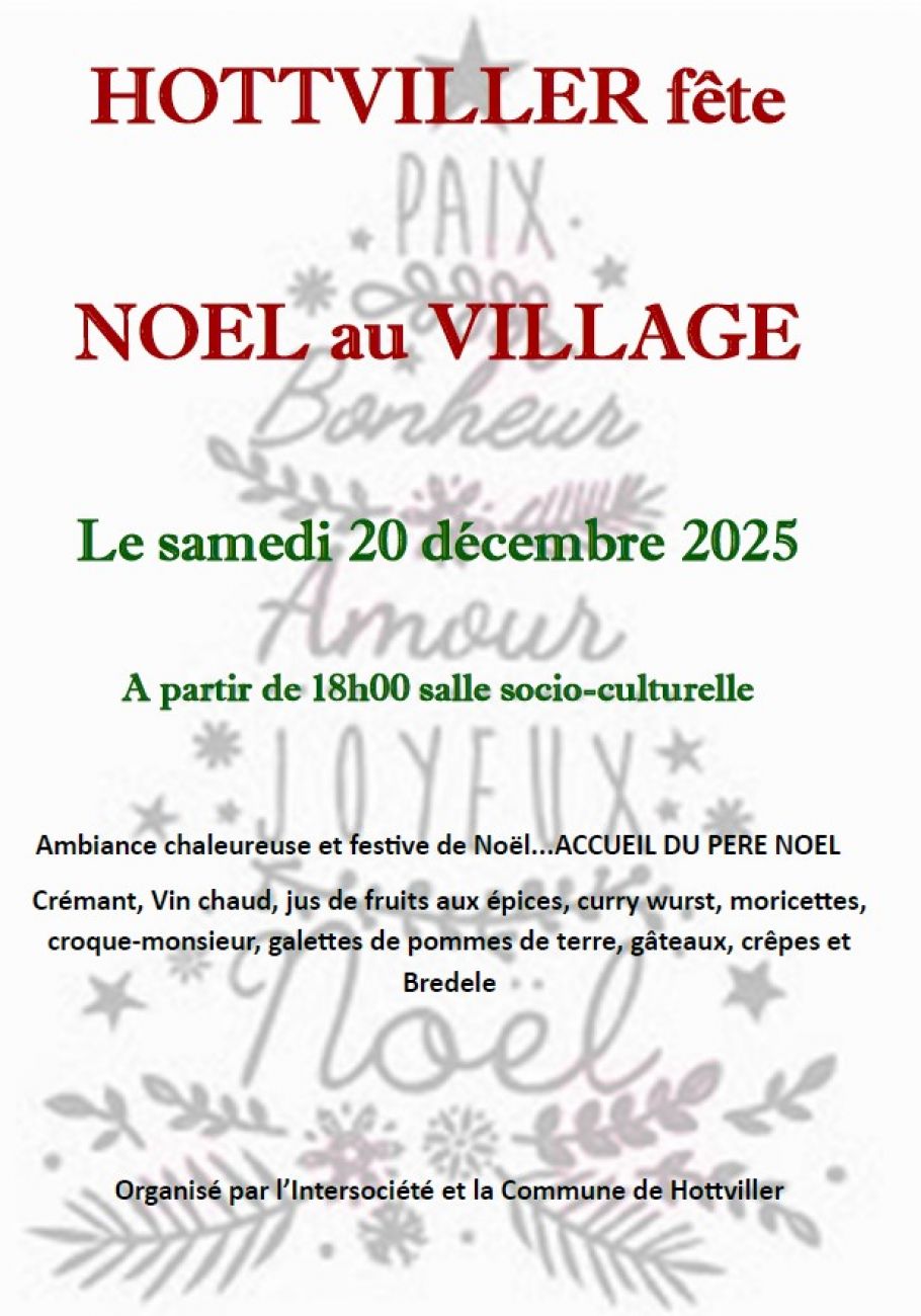 *Noël au village à Hottviller ! Une soirée est prévue à la salle socioculturelle samedi dès 18h. Après avoir sillonné les rues du village avec les sapeurs-pompiers de 18h à 19h, le père Noël sera présent à 19h30 dans la salle. Petite restauration avec galettes de pommes de terre et compote, crêpes, biscuits de Noël, curry-wurst, malicettes, et les traditionnelles boissons de saison.