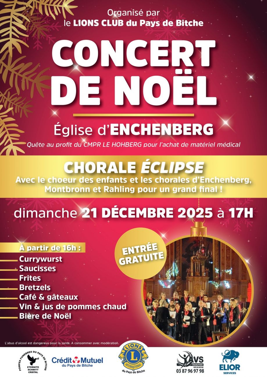 *Concert de Noël ce dimanche à 17h en l’église Saint-Pierre d’Enchenberg. Il y aura la chorale Eclipse, avec le Chœur des enfants et les chorales d'Enchenberg, Montbronn et Rahling pour un grand final. Entrée gratuite. A partir de 16h : currywurst, saucisses, frites, bretzel, vin et jus de pommes chaud.