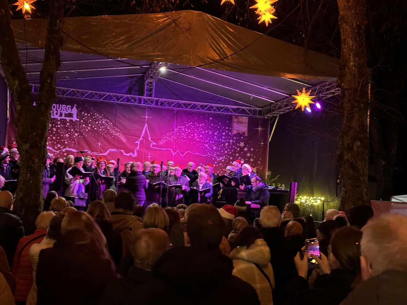 Le Chœur d’Hommes de Hombourg-Haut accompagne et embelli la balade sur ce marché resplendissant avec ses illuminations. Peggy retrouve la féerie de Noël à travers cette ambiance.