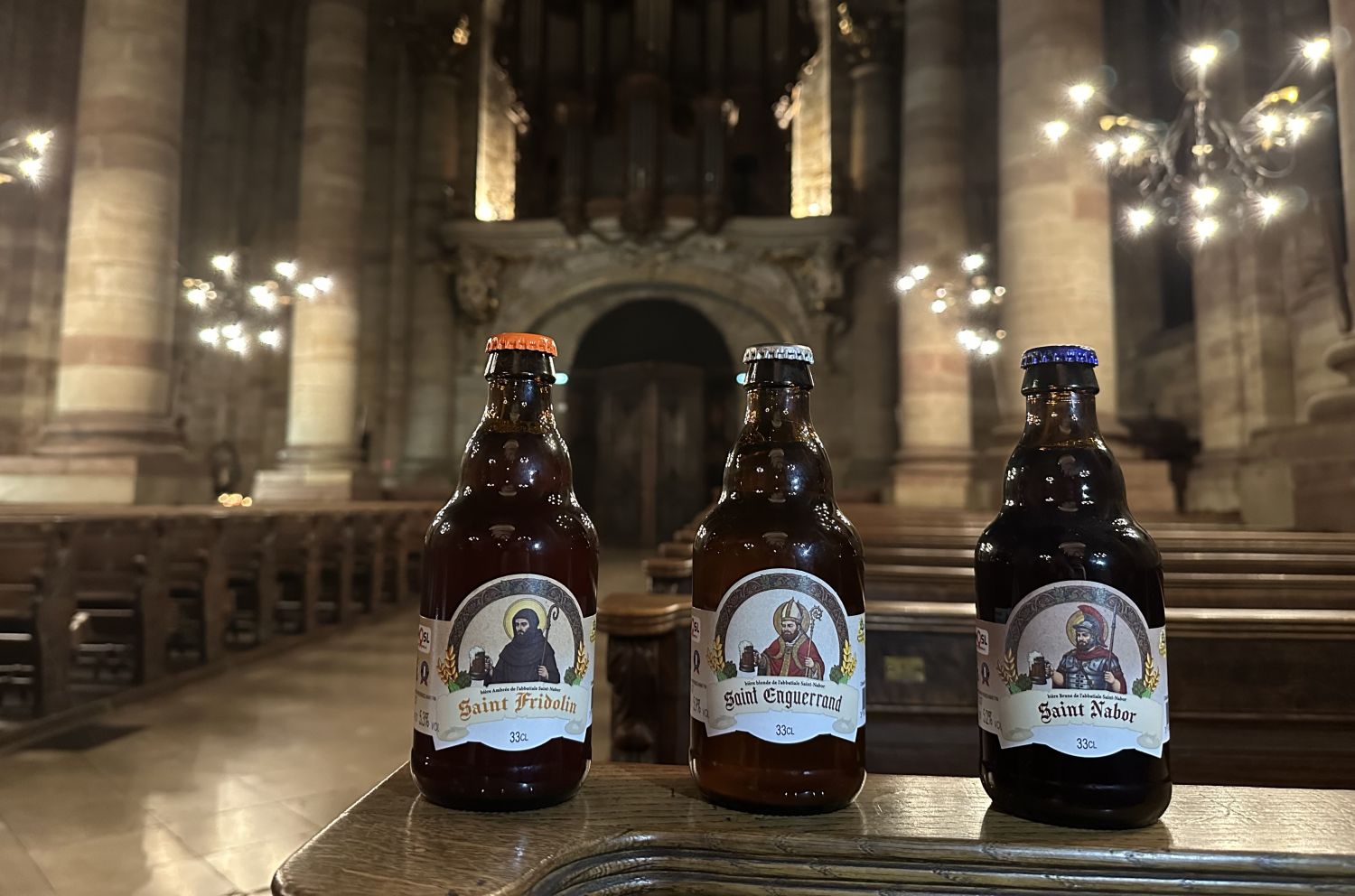 Saint-Nabor pour la bière brune, Saint-Fridolin pour la bière ambrée et Saint-Enguerrand pour la bière blonde. Ces trois bières sont nos bières historiques. Ce sont les trois premières bières que nous avons lancées, il y a 14 ans.