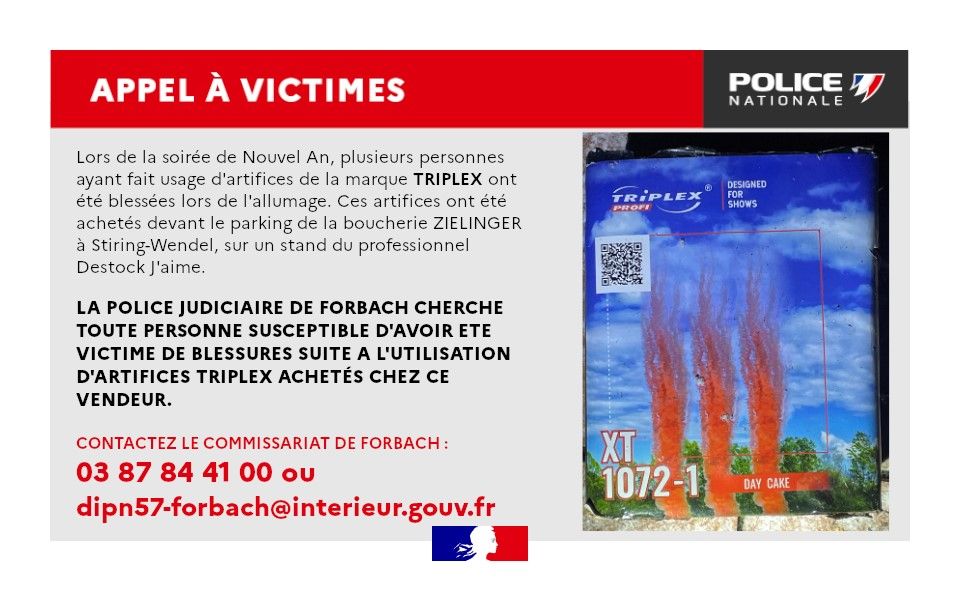 Le commissariat de Forbach lance un appel à victimes ce vendredi 2 janvier. Lors de la soirée du Nouvel An, plusieurs personnes ayant fait usage d'artifices de la marque Triplex ont été blessées lors de l'allumage.