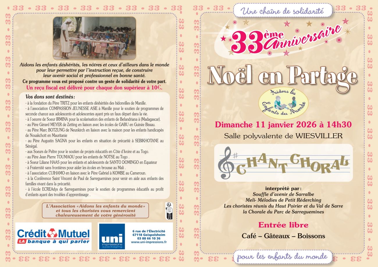 Ce dimanche, plusieurs chorales de la région donneront de la voix à la salle polyvalente de Wiesviller, à partir de 14h30. Ce concert de « Noël en partage » a pour but de récolter des dons pour aider les enfants du monde. Entrée libre.