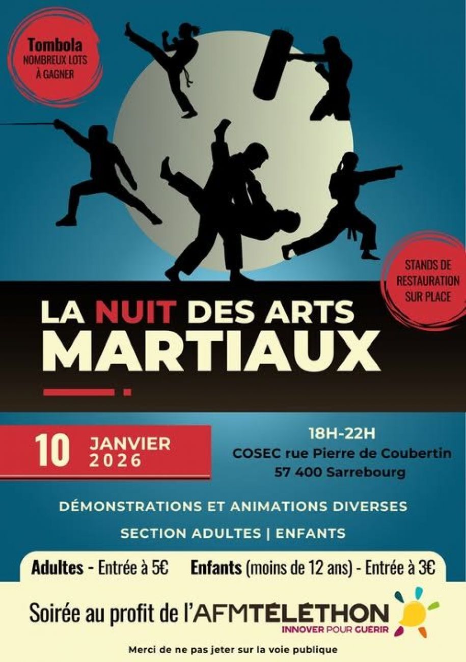 Rendez-vous samedi soir pour la nuit des arts martiaux à Sarrebourg. De nombreuses disciplines seront en demonstration dès 18h au COSEC. Les bénéfices seront reversés au Téléthon.