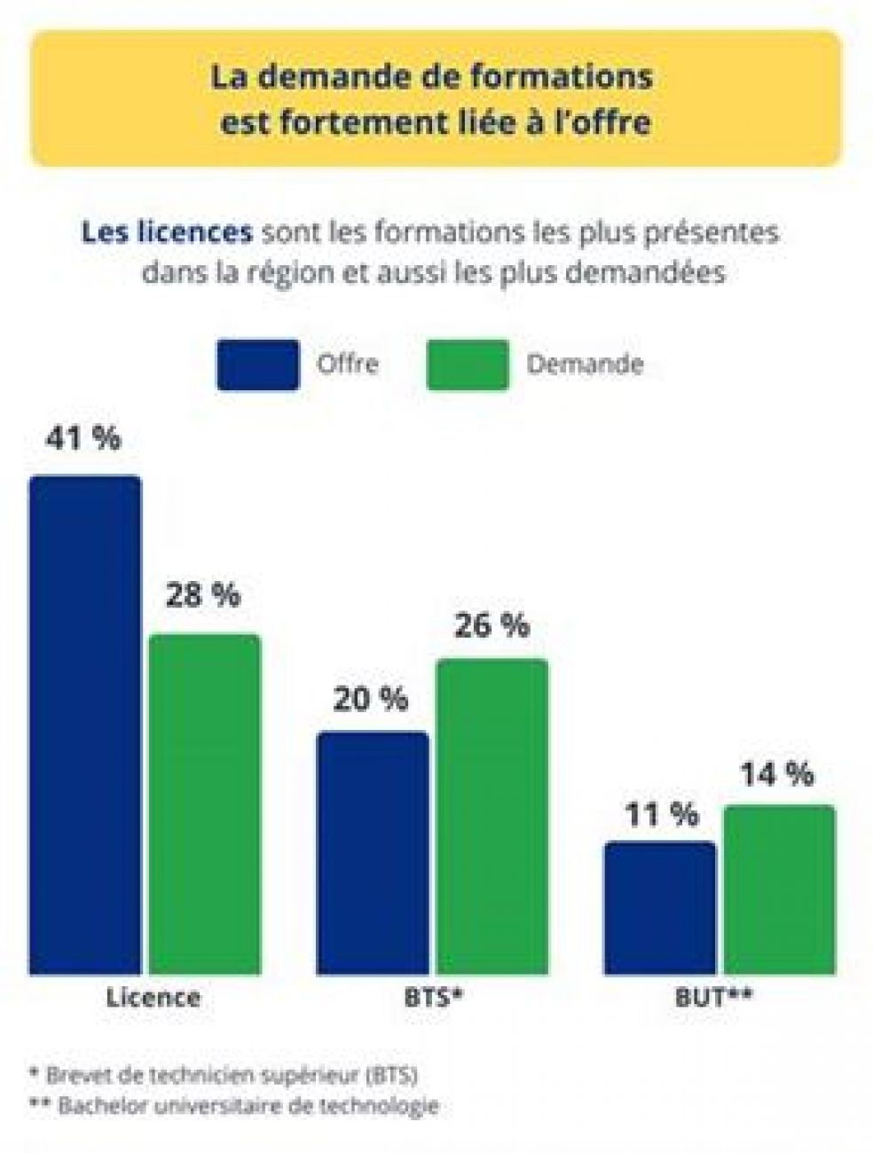 Concernant le choix de la formation, les filières les plus demandées sur Parcoursup sont aussi les plus présentes. 28% de la demande porte sur des licences qui représentent 41% des places de formation. Les BTS et les BUT sont également fortement demandés, mais l’offre est plus restreinte.