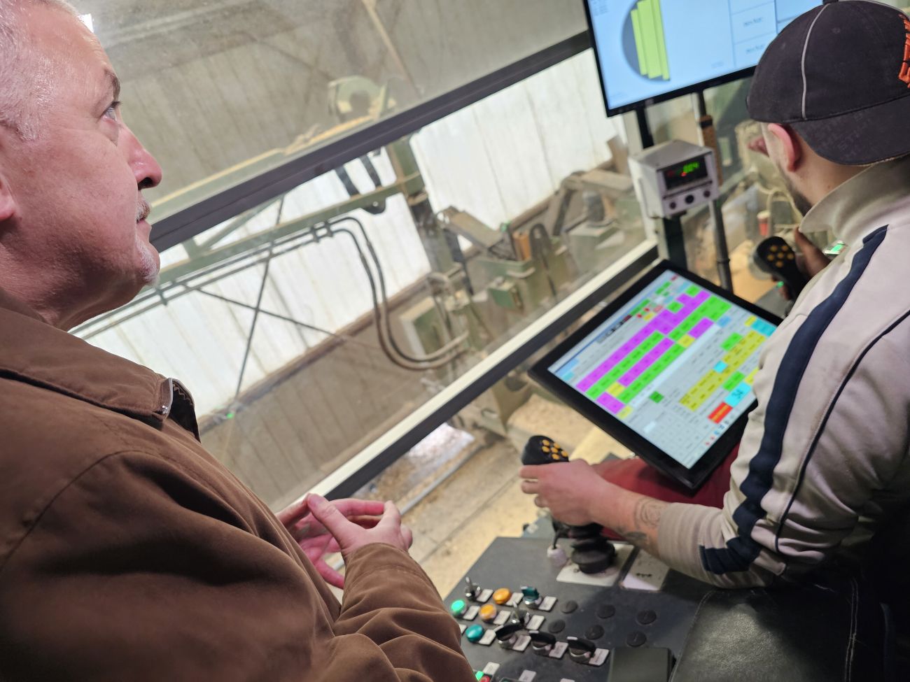 Ici, un opérateur est aux manettes d’une grue pour découper des grumes : d’imposants troncs d’arbre encore recouverts d’écorce.
