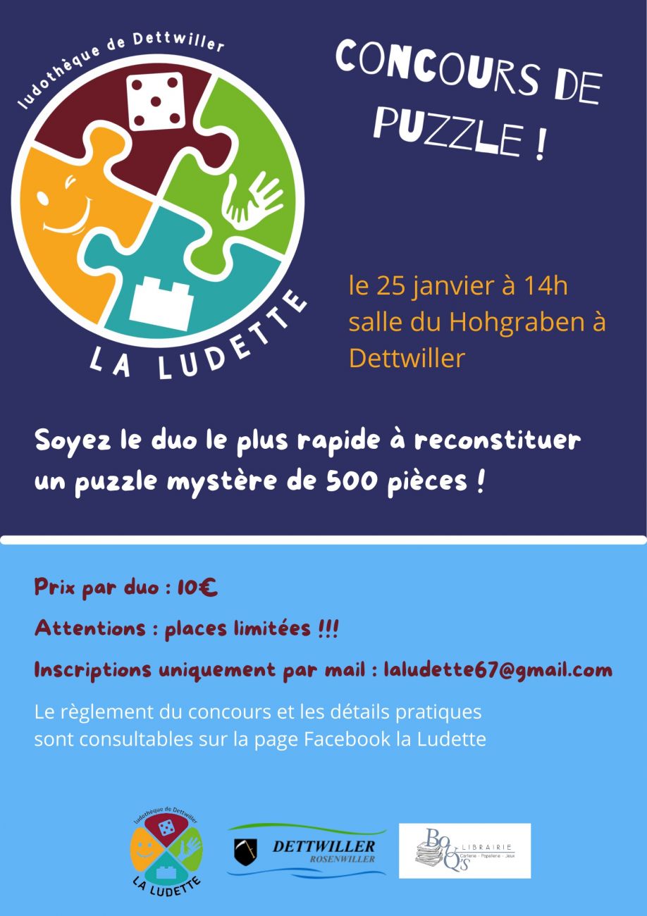 Un concours de puzzle, en duo a lieu ce dimanche à Dettwiller dans la salle du Hohgraben. Le concours démarre à 14h. Les participants devront assembler un puzzle mystère de 500 pièces le plus rapidement possible.
