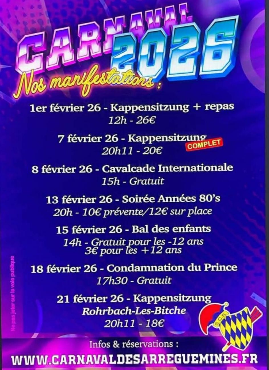 Notre nouveauté de cette année, le bal années 80 qui se passe à l’hôtel de ville de Sarreguemines le 13 février avec en animations DJ Chris (10€ en prévente), ensuite on aura aussi le dimanche 15 février le bal des enfants à l’hôtel de ville de Sarreguemines (3€ pour les +12 ans, gratuit pour les -12 ans). Ensuite, le mercredi 18 février nous aurons la condamnation du prince où il sera condamné… ou peut-être pas cette année, on verra !