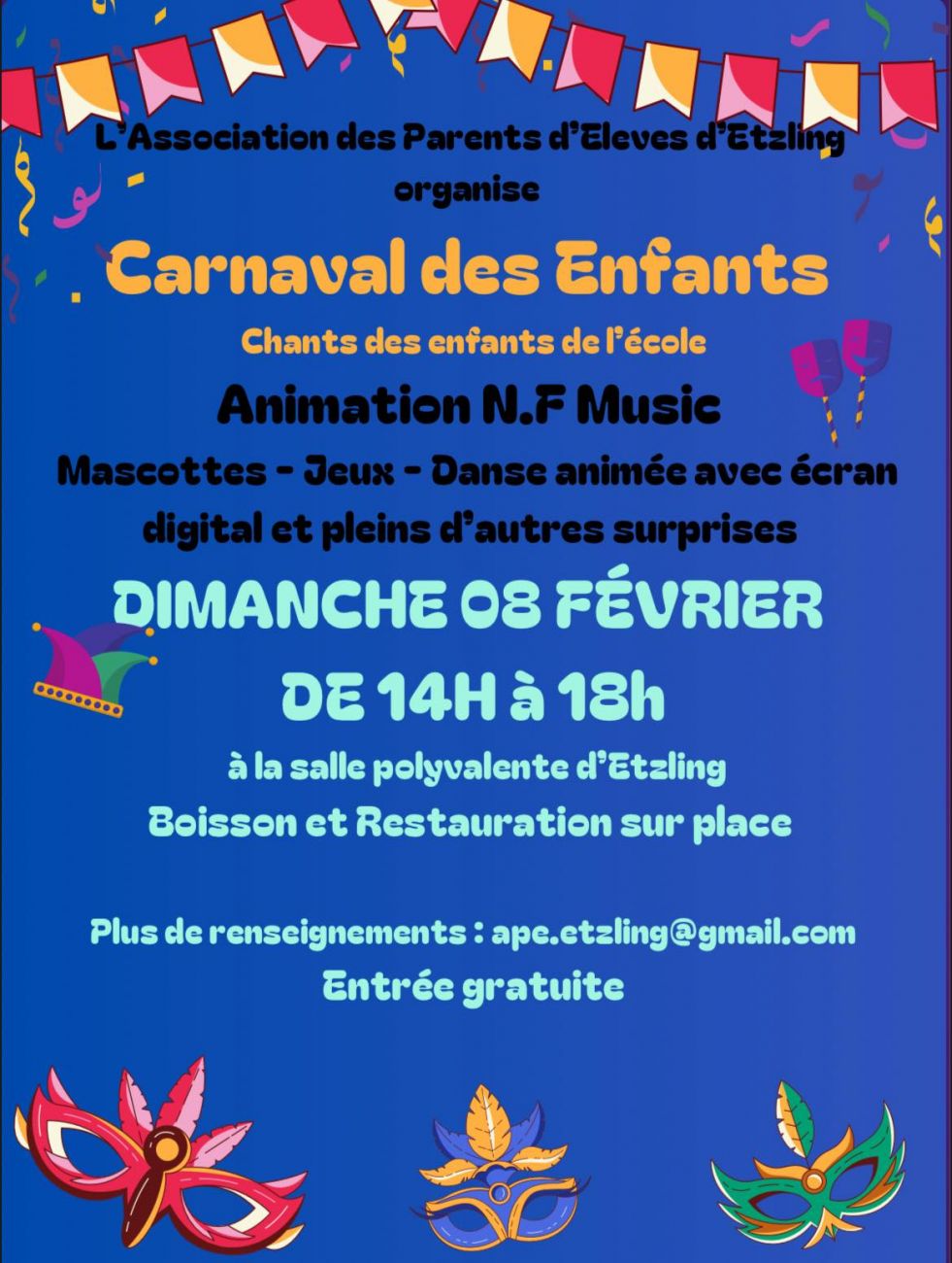 L’association des Parents d’Elèves d’Etzling organise un carnaval des enfants ce dimanche de 14h à 18h à la salle polyvalente d’Etzling. L’après-midi sera animé par NF Music avec mascotte, jeux et danse.