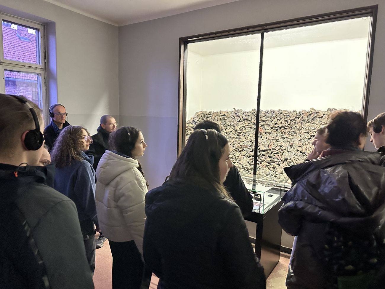 Dans le Bloc 5, le choc s’empare instantanément des lycéens qui prennent conscience des crimes nazis, avec les monticules d’effets personnels exposés et détaillés par notre guide Kévin Magnin.
