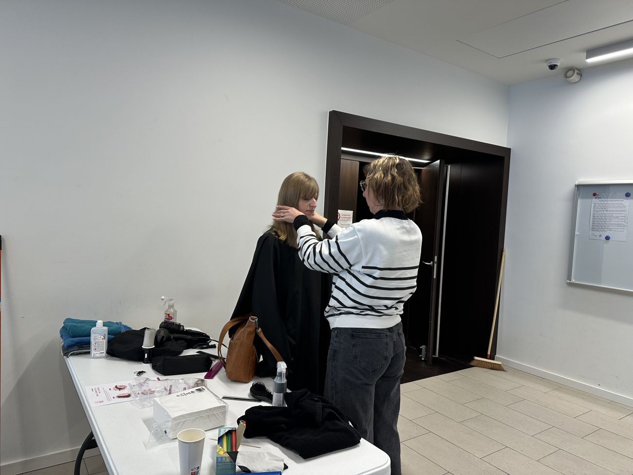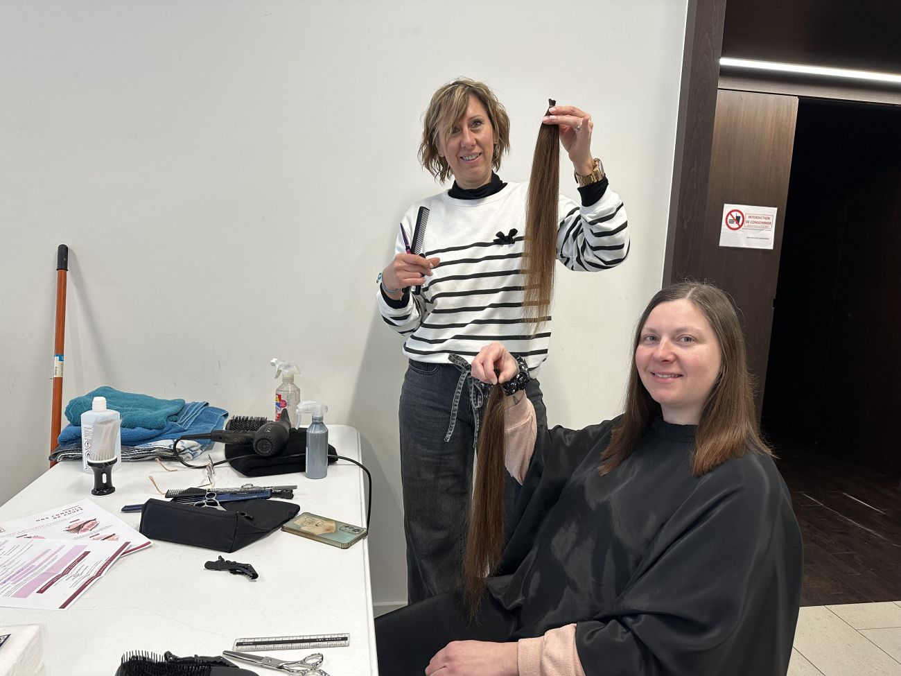 Deux coiffeuses bénévoles s’occupent de couper un minimum de 10 centimètres de longueur de cheveux sur les particuliers comme Catherine, venus pour la bonne cause.