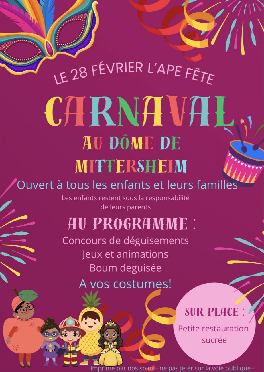 Un carnaval pour les enfants a lieu ce samedi à partir de 14h, au Dôme de Mittersheim. Des concours de déguisements, des jeux, et des animations sont au programme. Entrée libre.