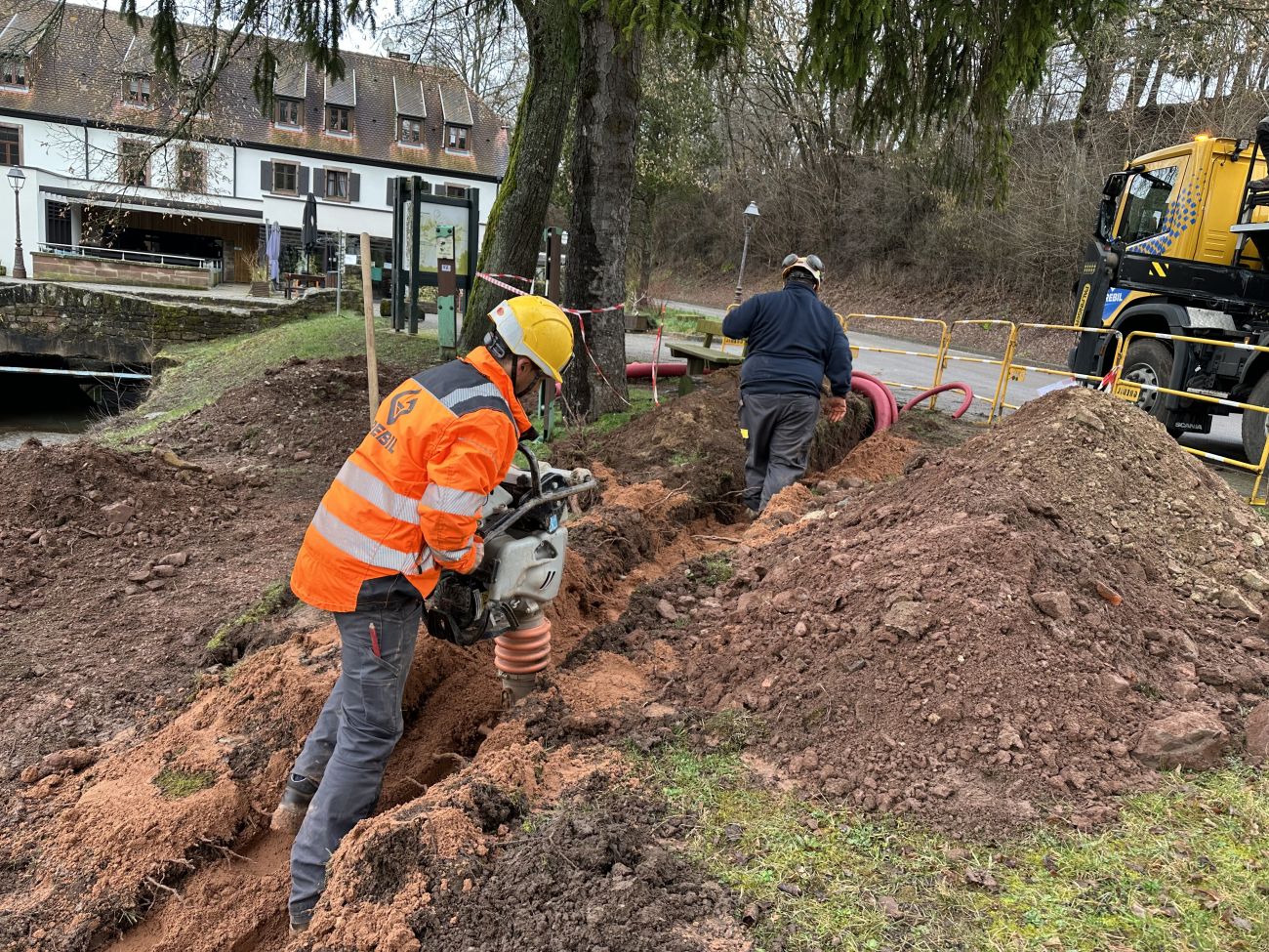 La pose des réseaux secs. Nous continuons avec l’empierrement des différents chemins et sentiers, pour, à la fin, venir couler un béton balayé, sur les 800 mètres linéaires de sentiers piétons.