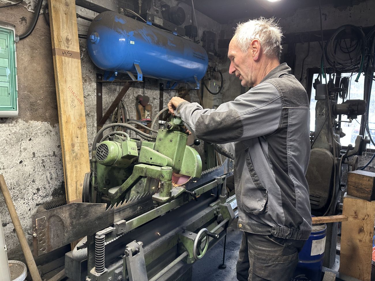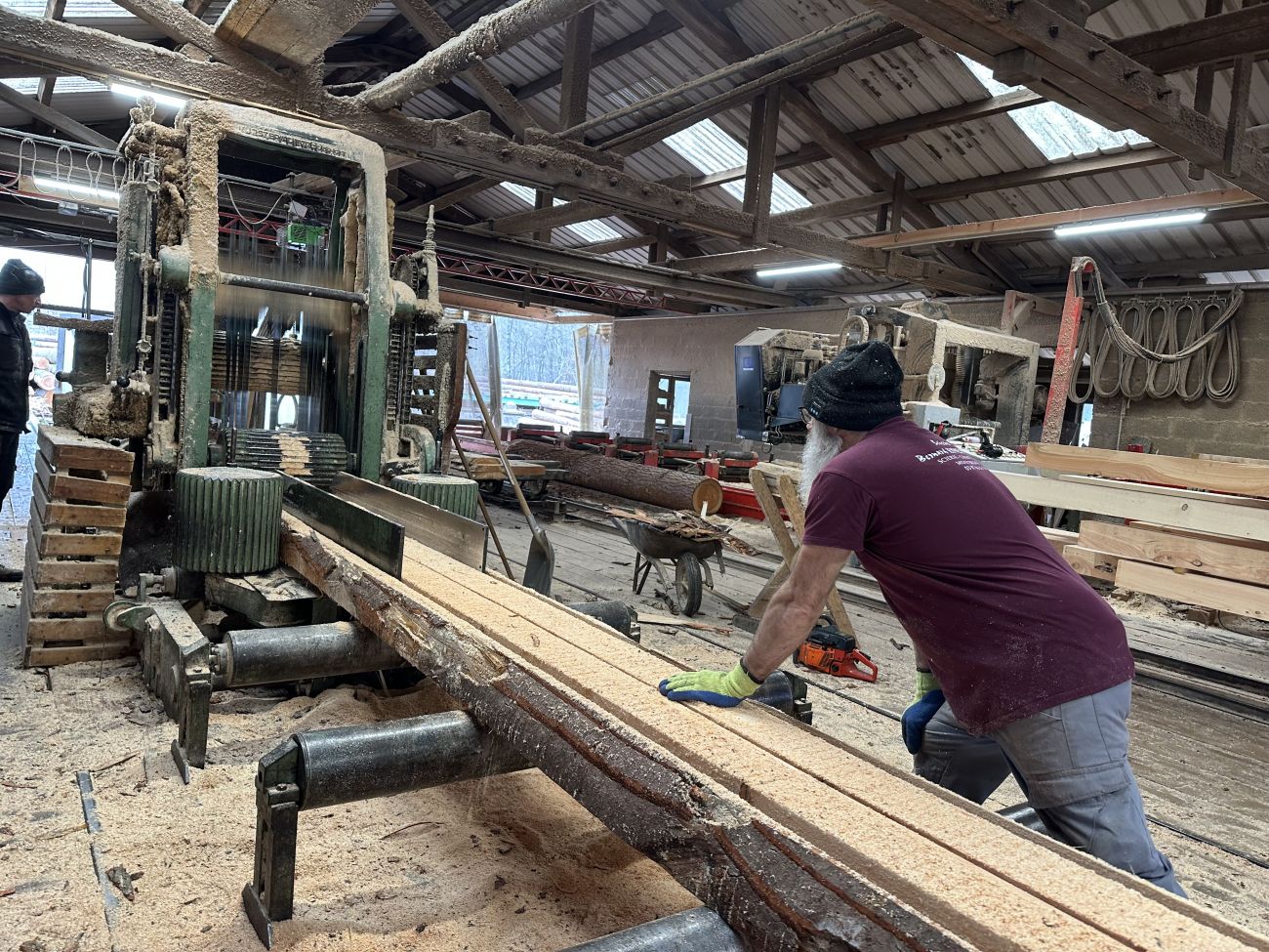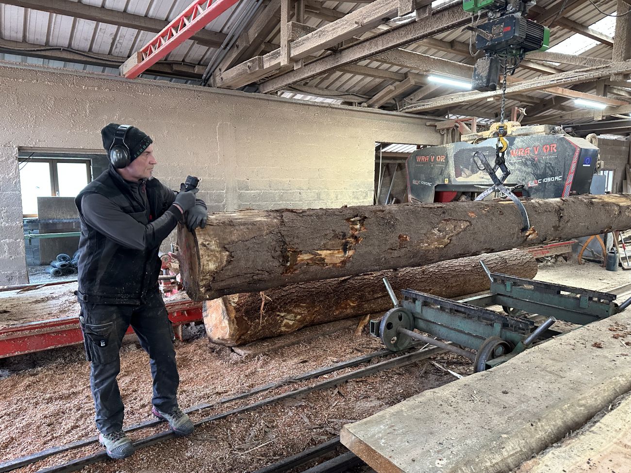 Les troncs d’arbres entiers, principalement d’épicéas et de douglas, sont sciés ici. Guillaume est charpentier, il fait partie de la 4e génération de Rimlinger, avec sa sœur Stéphanie.