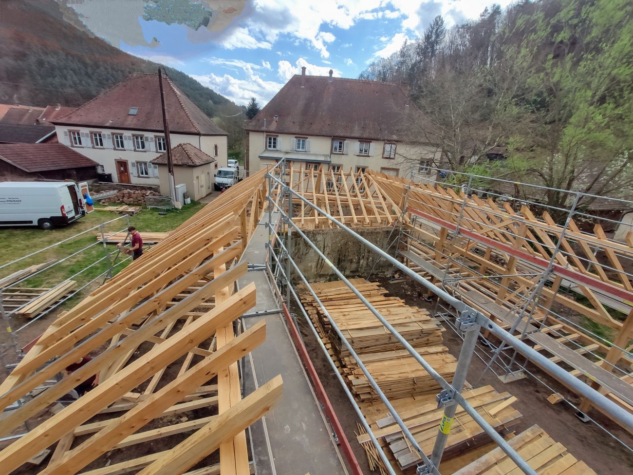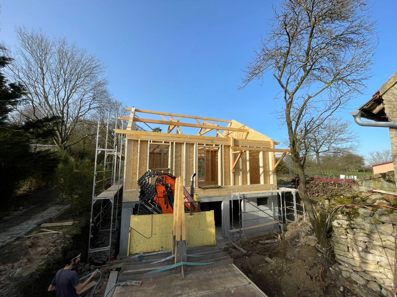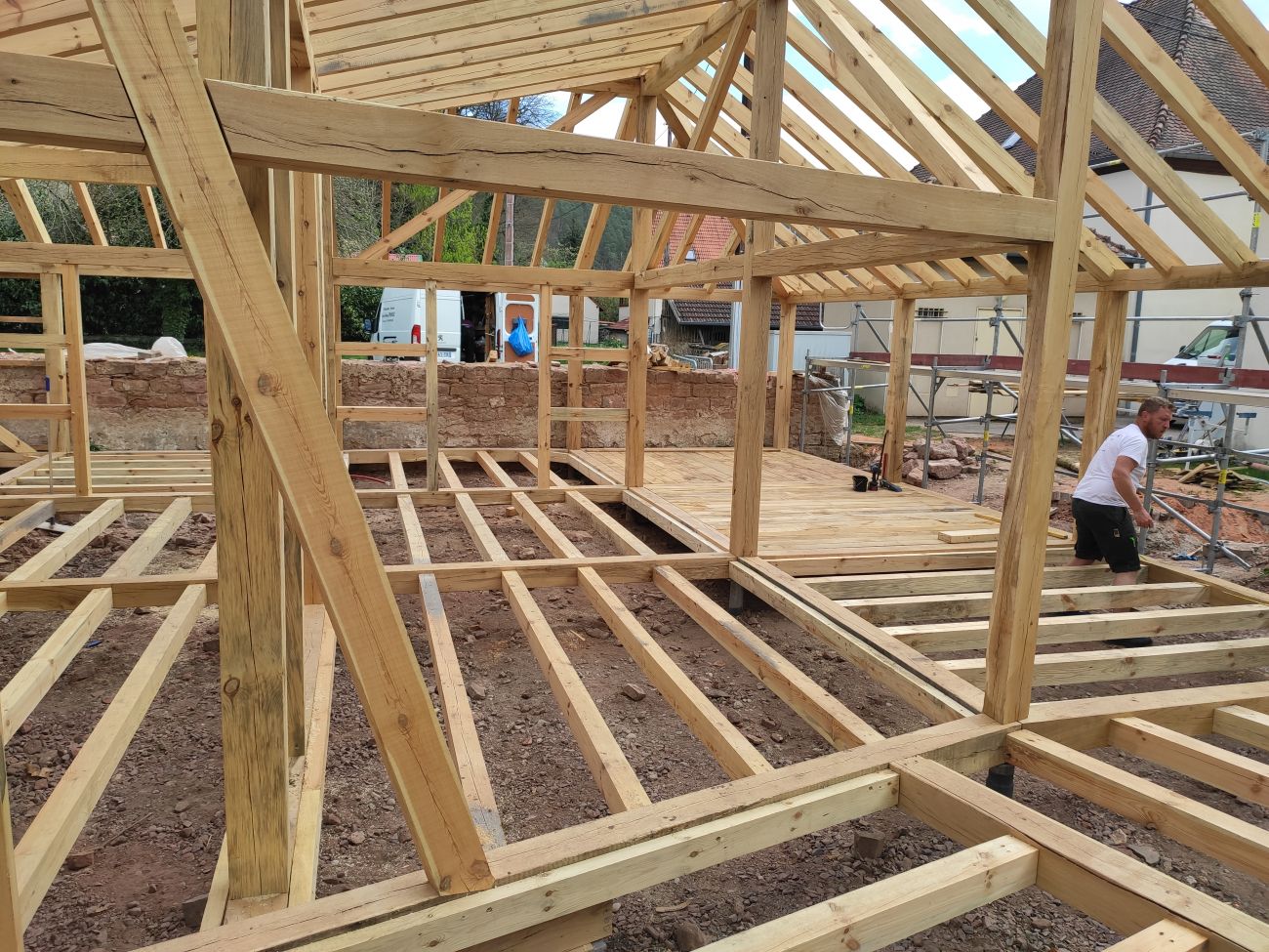 On fabrique tout, de A à Z, de la base, jusqu’en haut, en termes structurel. On fabrique la dalle du sol, on fabrique les murs, on fabrique le solivage qui va tenir le plafond, et on fabrique la charpente, évidemment. On a pas mal de cordes à notre arc.