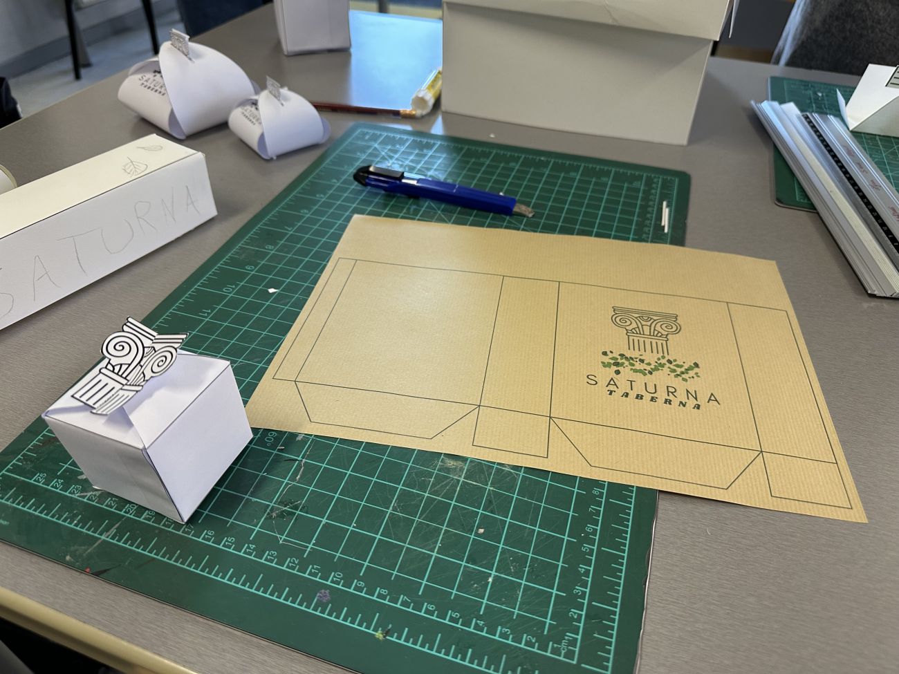 Cloé et ses camarades travaillent sur la maquette de la Saturna Taberna, un lieu imaginaire où seraient vendus leurs produits de bouche inspirés de la Rome Antique. Un nom choisi par les élèves qui ont voulu mixer les notions de streetfood et de la fête qui célèbre le solstice d’hiver à l’époque de l’Empire Romain.