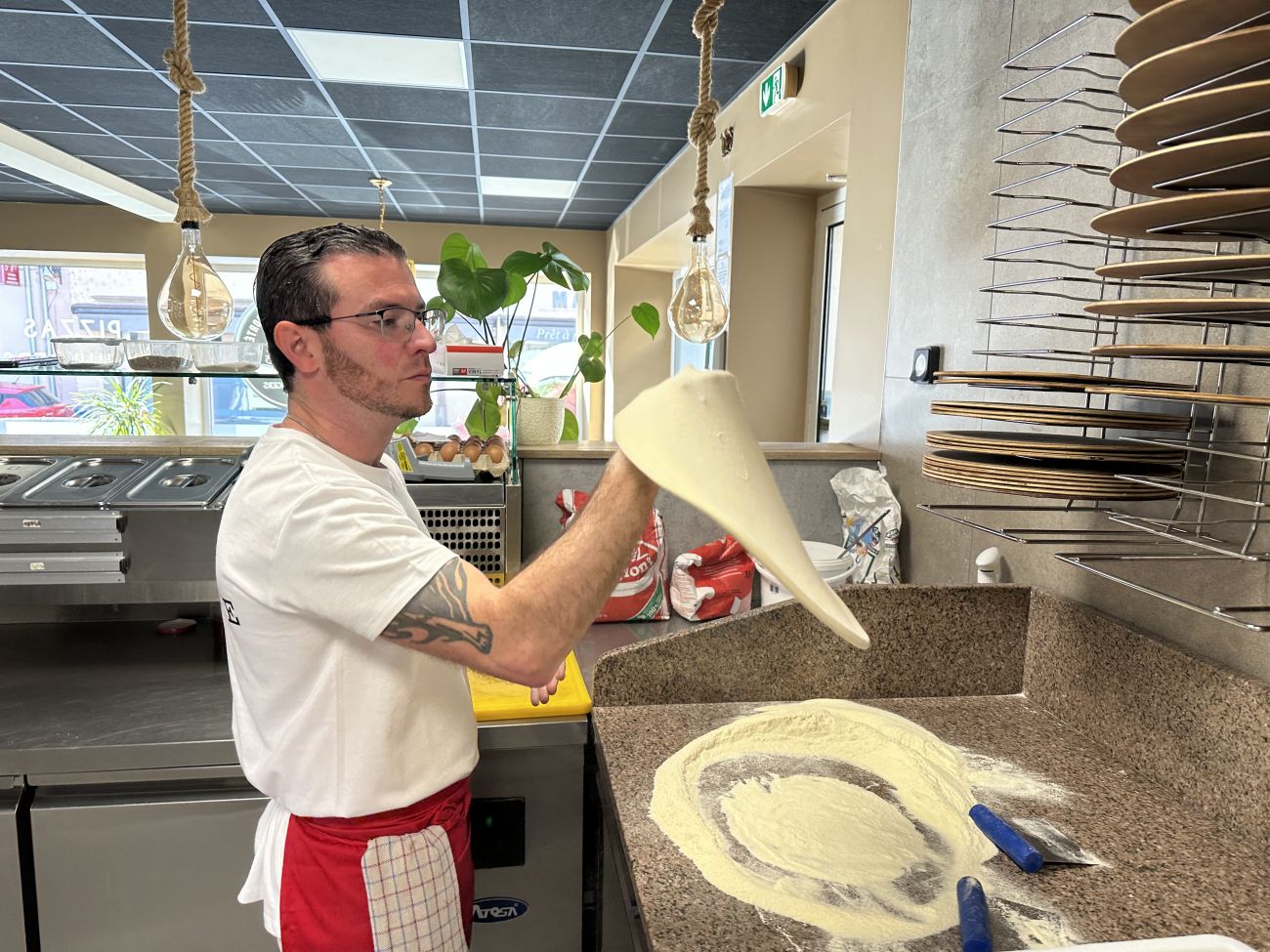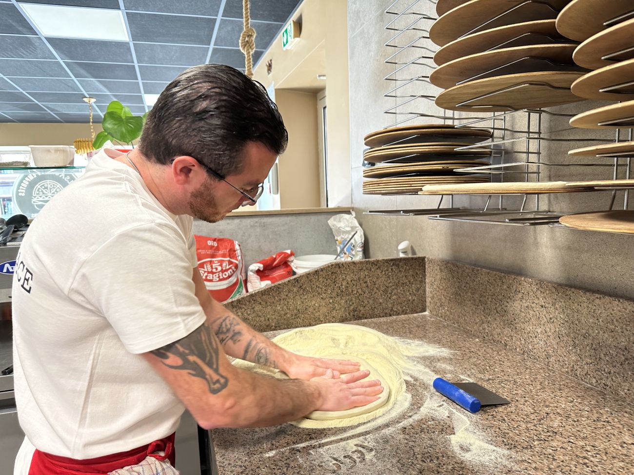 C’est avec ce geste sûr que Vivien prépare les pizzas. Pour le championnat de France il a décidé de faire une pâte assez technique.