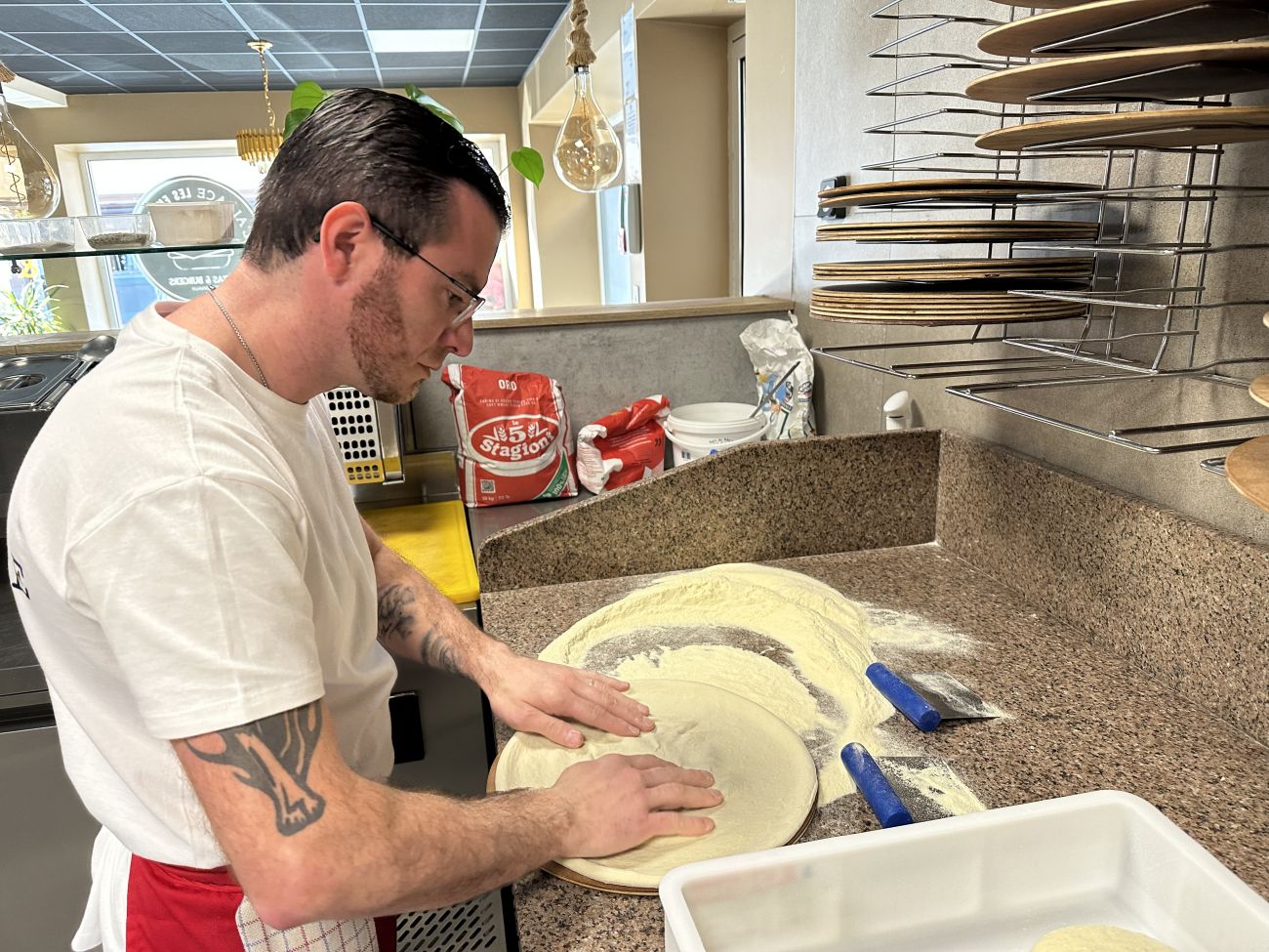 Pizzaïolo depuis 2006, il retravaille également tous les ingrédients de sa pizza comme les oignons qui macèrent dans un bocal.