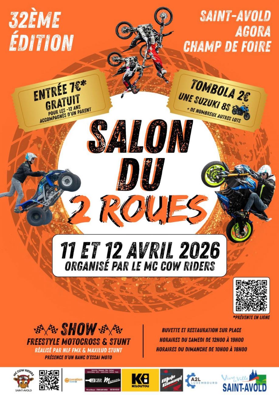 Le salon du deux-roues revient à Saint-Avold tout le week-end. Au programme de cette 32e édition : Show freestyle motocross et Stunt ; présence d'un banc d'essai moto ; tombola ; buvette et restauration. Plein tarif : 7€ la journée. Samedi de 12h à 19h, dimanche de 10h à 18h.