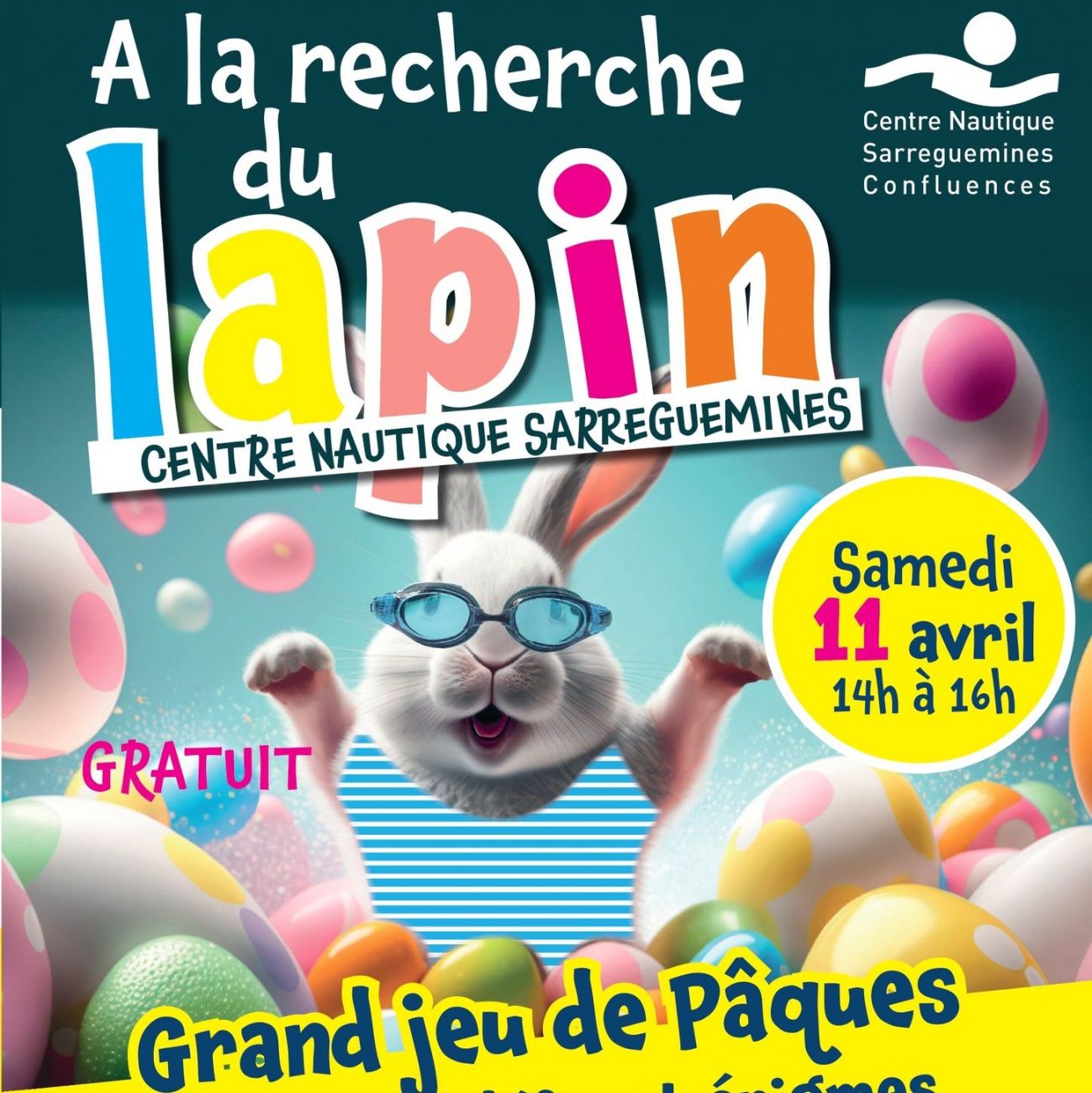 Ce samedi vous pourrez partir à la recherche du lapin de Pâques caché dans la piscine de Sarreguemines. Le centre nautique vous propose plusieurs défis et énigmes entre 14h et 16h. participation libre.