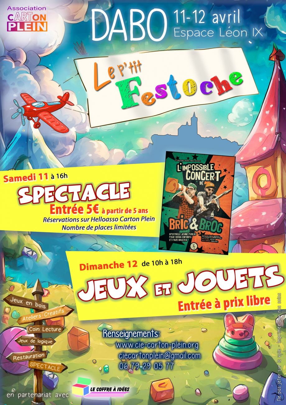 Tout le week-end, le P’tit Festoche revient à Dabo. Samedi à 16h, un spectacle sera proposé par l’association Carton Plein. Dimanche, de 10h à 18h, la salle Léon IX se transformera en salle de jeux et de jouets. Il y en aura pour tout le monde et pour tous les âges. Entrée : vous décidez du prix.