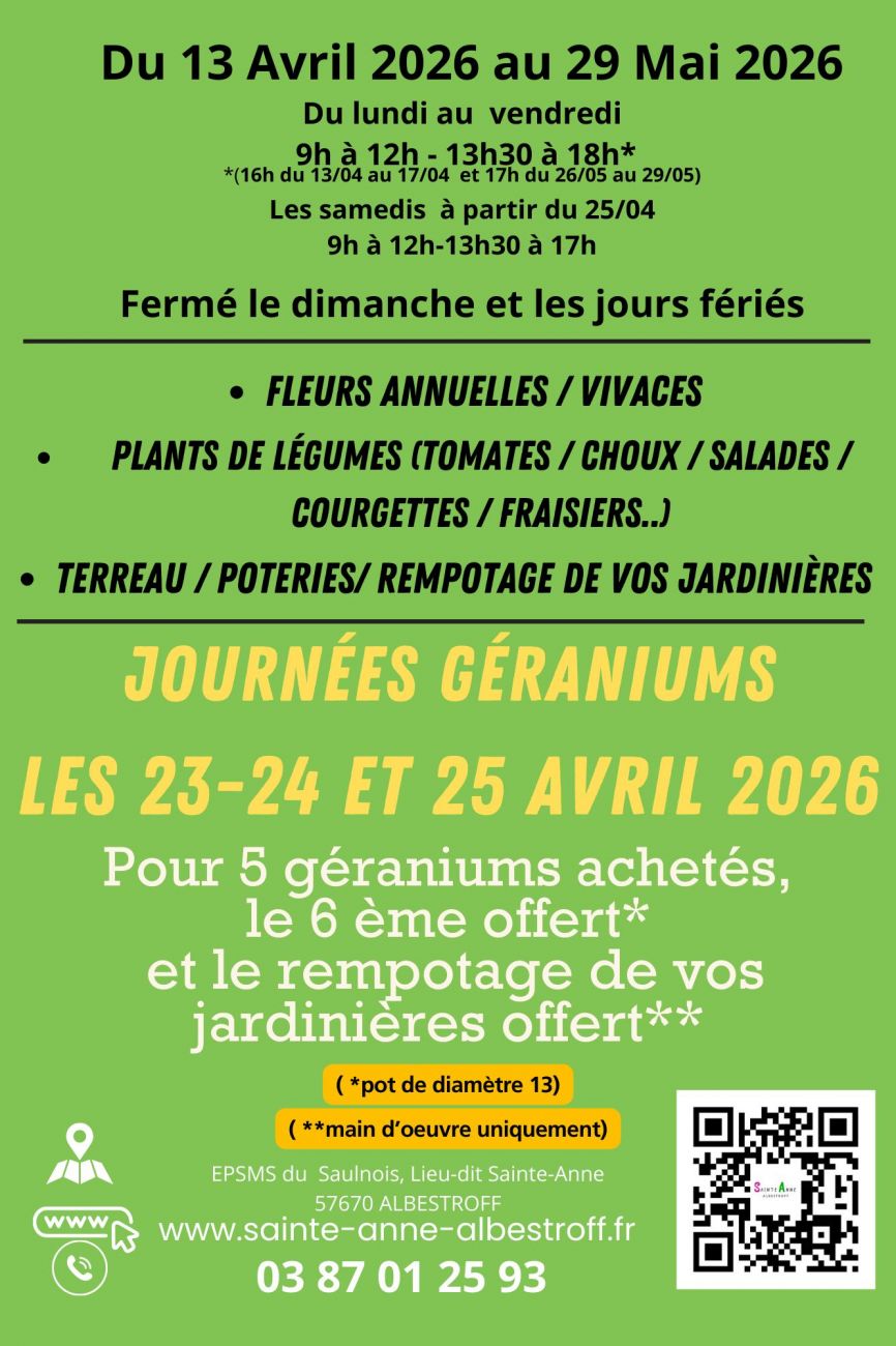 Vente : du 13 avril au 29 mai avec les journées géranium du 23 au 25 avril. Ouvert à tous. 4 serres pleines de plantes sont disponibles.