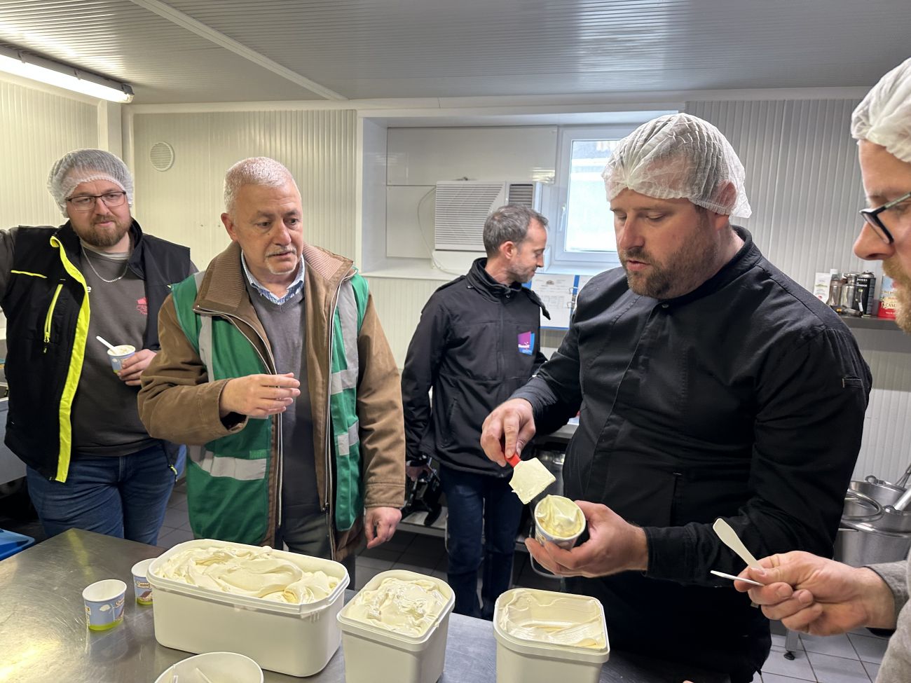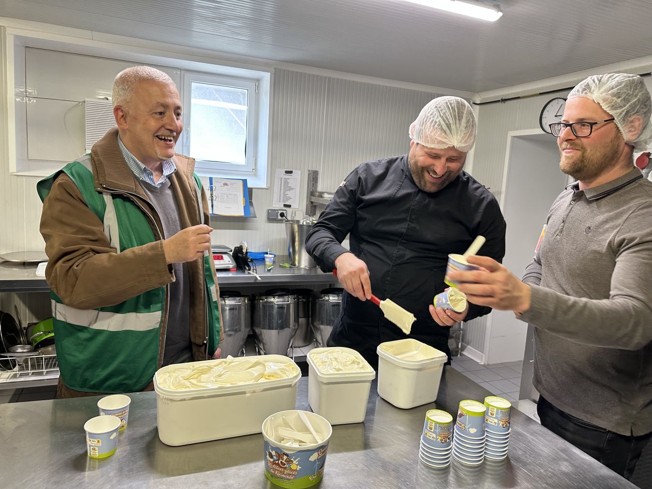 Le sous-préfet de Sarreguemines, Wassim Kamel, poursuit ses visites d’entreprises du territoire. Vendredi 10 avril, il a découvert l’exploitation Gaec du Hêtre avec la ferme du Kleinwald à Breidenbach. C’est à cet endroit que la visite a débuté, plus précisément dans la cuisine des Délices Glacés du Kleinwald où la glace est en cours de préparation.