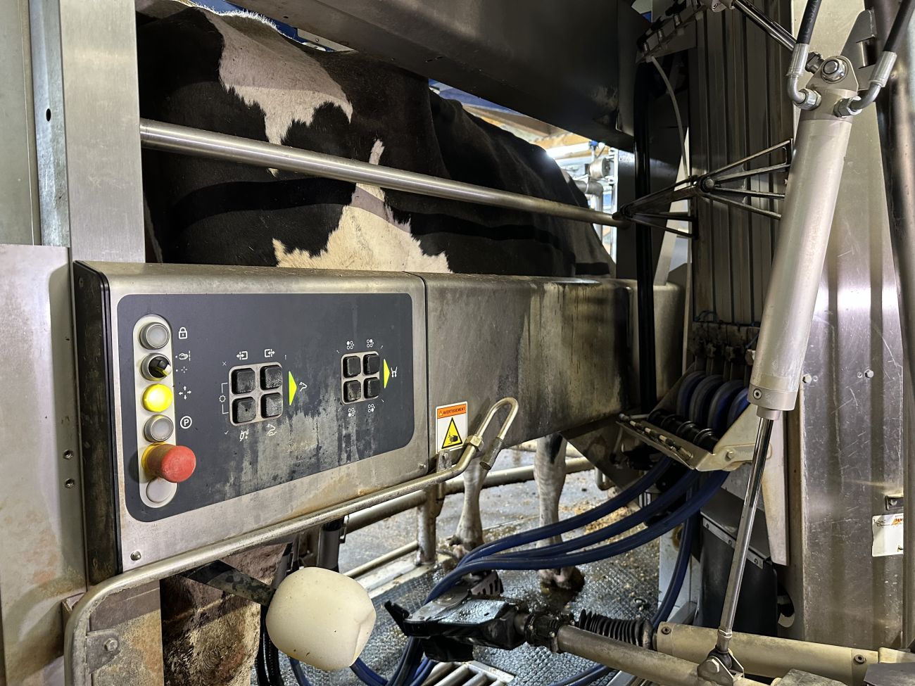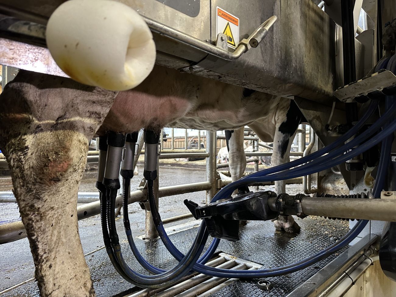 -Ça trait automatiquement les vaches, tout au long de la journée. On fait à peu près 2200 litres tous les jours avec une soixantaine de vaches.