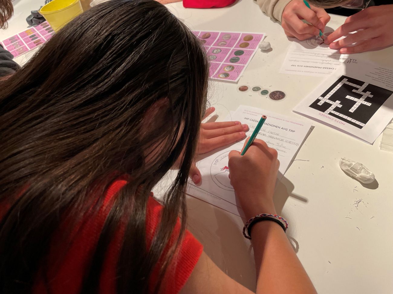 Après des explications sur les trouvailles locales, les participants comme Juline et Noah ont pu étudier les monnaies romaines.