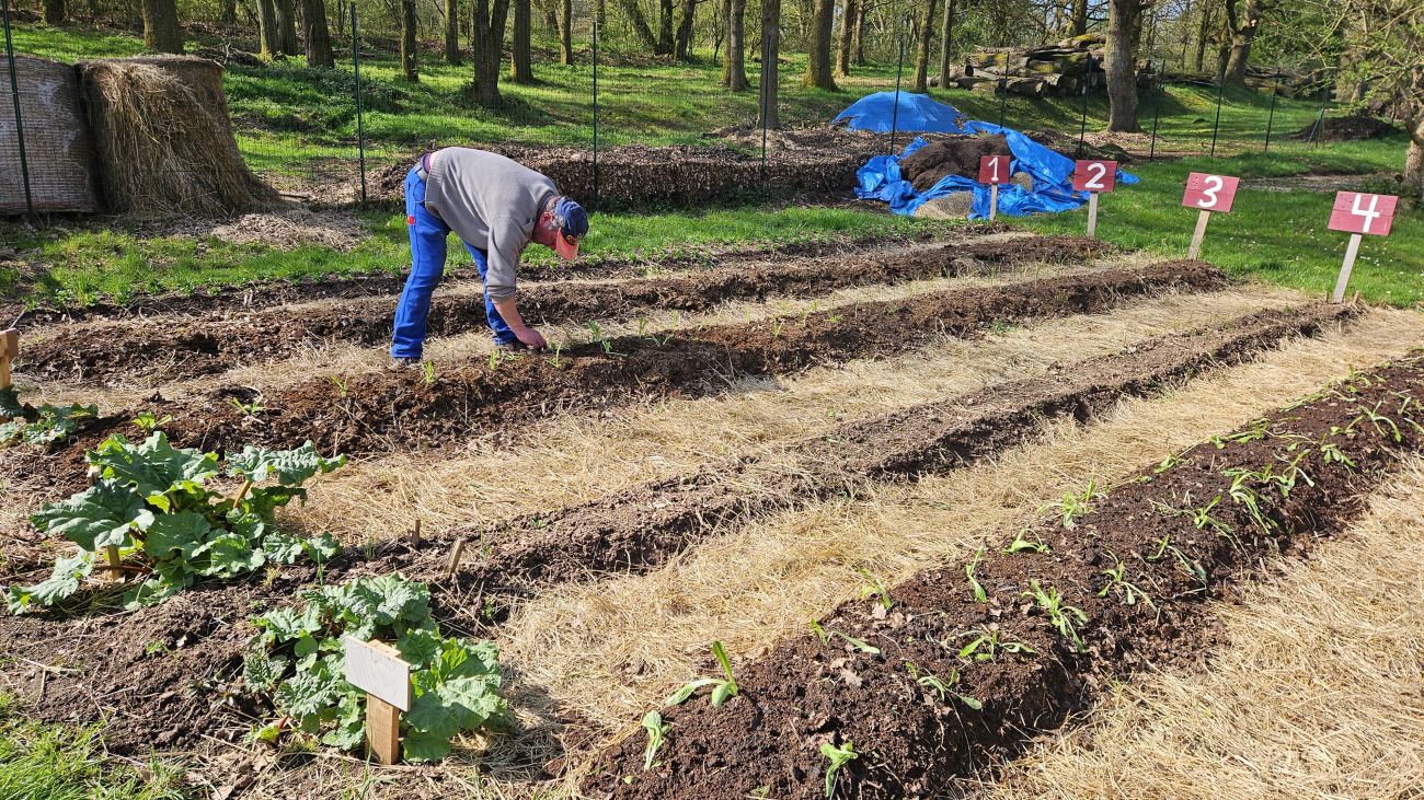 En bas, on a commencé à mettre les courgettes et concombres. Là, il y a Vincent qui est en train de mettre des salades qui seront destinées aux distributions pour les Restos du Cœur.