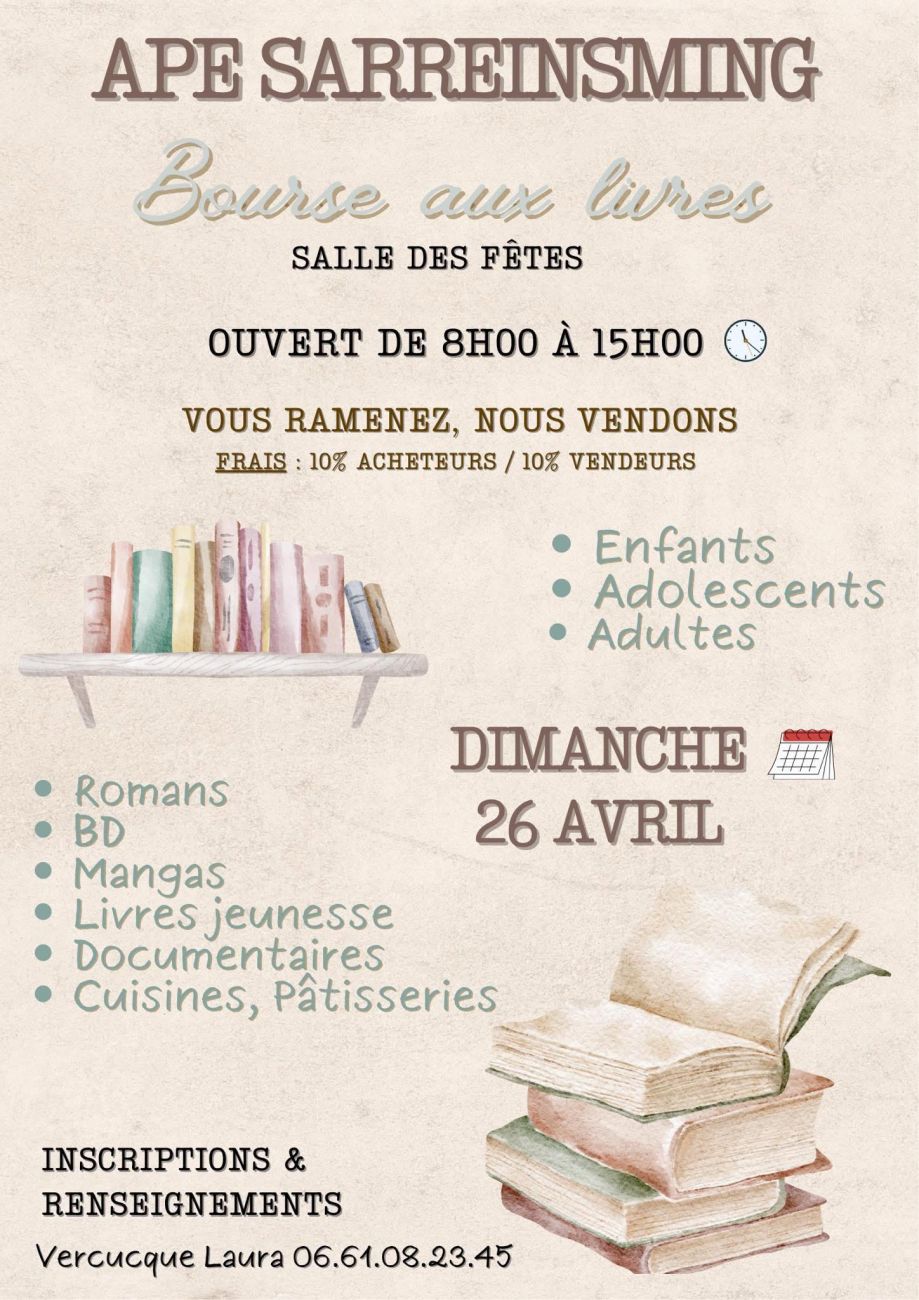 A Sarreinsming, une bourse aux livres se tiendra de 8h à 15h ce dimanche à la salle des fêtes.