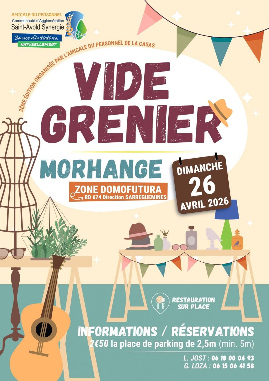 3ème édition du vide-greniers tenu par l'amicale du personnel de la CASAS ce dimanche. L’événement se déroulera sur le parking de la zone Domofutura à Morhange. Sur place, une restauration sera assurée.