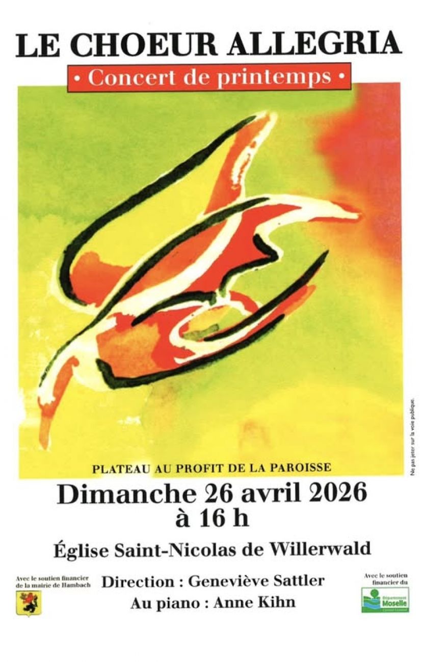 A Willerwald, le concert de printemps du Chœur Allegria se tiendra ce dimanche à 16h au sein de l’Eglise Saint-Nicolas. Vous pourrez y découvrir une vingtaine de chants de divers registres. La participation est libre.