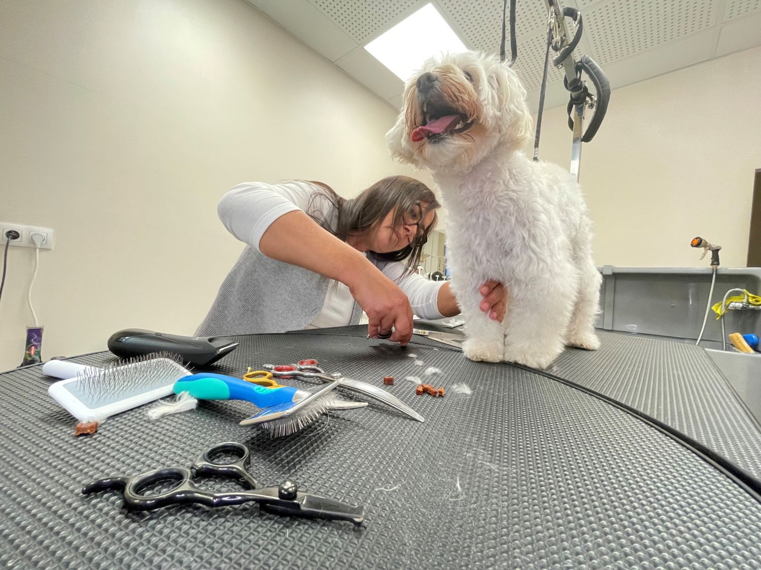 Parce que je veux créer un climat de confiance avec le chien et moi-même, avec le propriétaire aussi. Quand il vient au salon, il a des questions, il a besoin d’être rassuré. Et le chien, en aucun cas je veux le forcer, en quoi que ce soit. Je veux prendre mon temps.