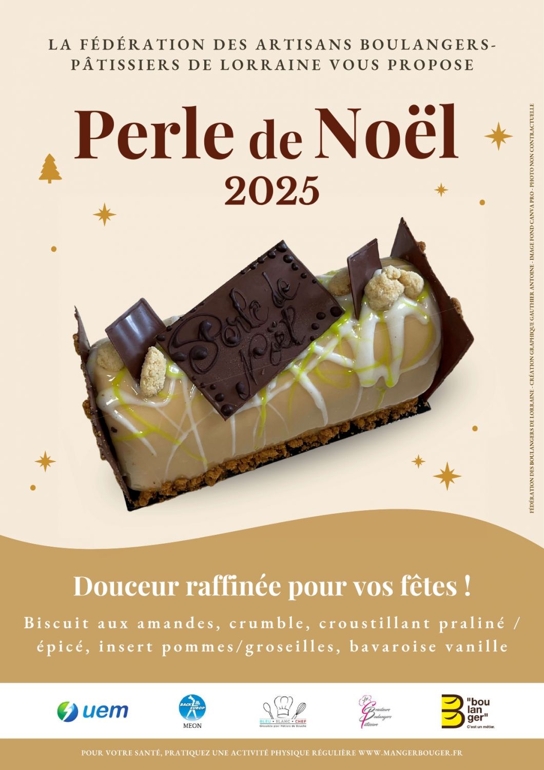 Comme chaque année, les boulangers du département proposent « La Perle de Noël ». Pour les fêtes de fin d’année 2025, il s’agit d’une douceur épicée composée d’un biscuit aux amandes, d’un croustillant praliné/épices, d’un insert pommes poêlées-groseilles et d’une bavaroise vanille enveloppée d’un glaçage caramel. Des boulangeries de Dabo, Diesen, Francaltroff, Hambach, Longeville-lès-Saint-Avold, Rémering-lès-Puttelange ou encore Sarreguemines la proposent.