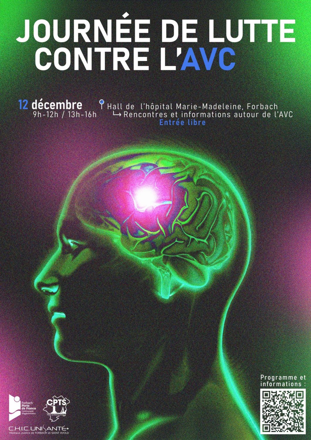 Des médecins tiendront deux conférences dans le hall de l’hôpital, une à 10h30 et une autre à 14h30, pour vous expliquer les facteurs de risques d’accidents vasculaire cérébraux, les traitements qui existent et comment reconnaître les signes d’alerte.