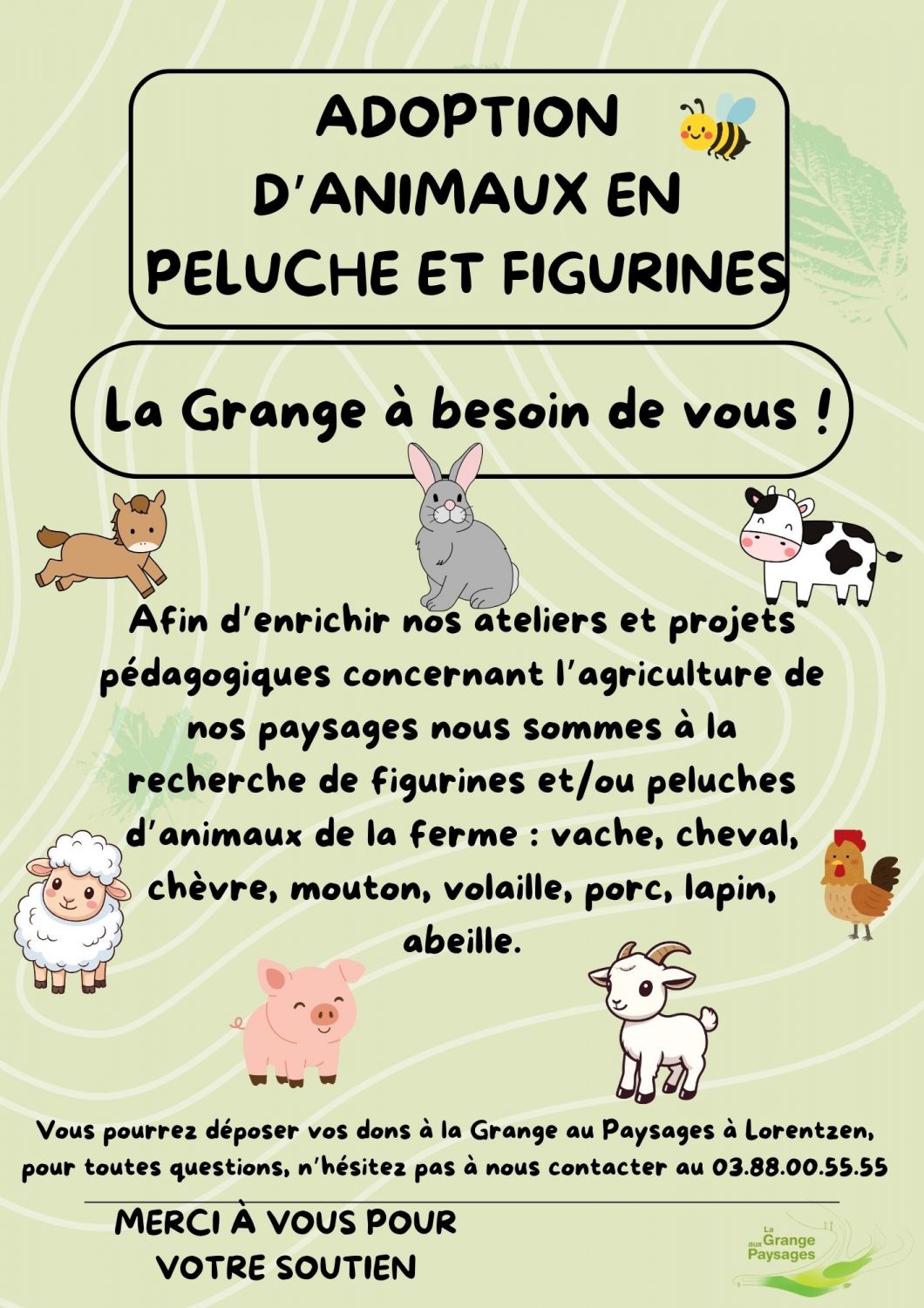 Pour enrichir les ateliers et projets pédagogiques concernant l’agriculture de nos paysages, la Grange aux paysages a besoin de figurines et peluches d’animaux de la ferme.