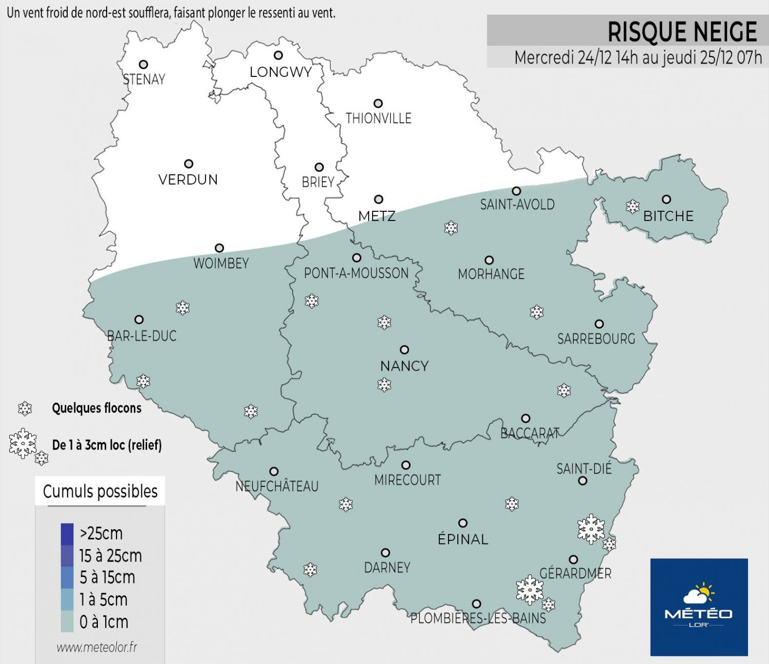 La Moselle-Est, la Moselle-Sud et l’Alsace-Bossue sont concernées. Malheureusement, la neige ne sera visible que dans les airs a priori, pas de couche blanche au sol au programme.