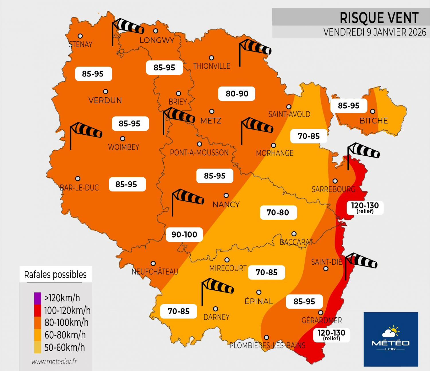 Après la neige et le verglas, place au vent. D’après Météo Grand Est, la tempête Goretti va entraîner des rafales jusqu’à 130 km/h sur les reliefs lorrains et alsaciens au niveau des Vosges et jusqu’au secteur de Sarrebourg. Pour la Moselle-Est et l’Alsace Bossue, en plaine, des vents jusqu’à 95 km/h sont attendus pour la journée de vendredi.