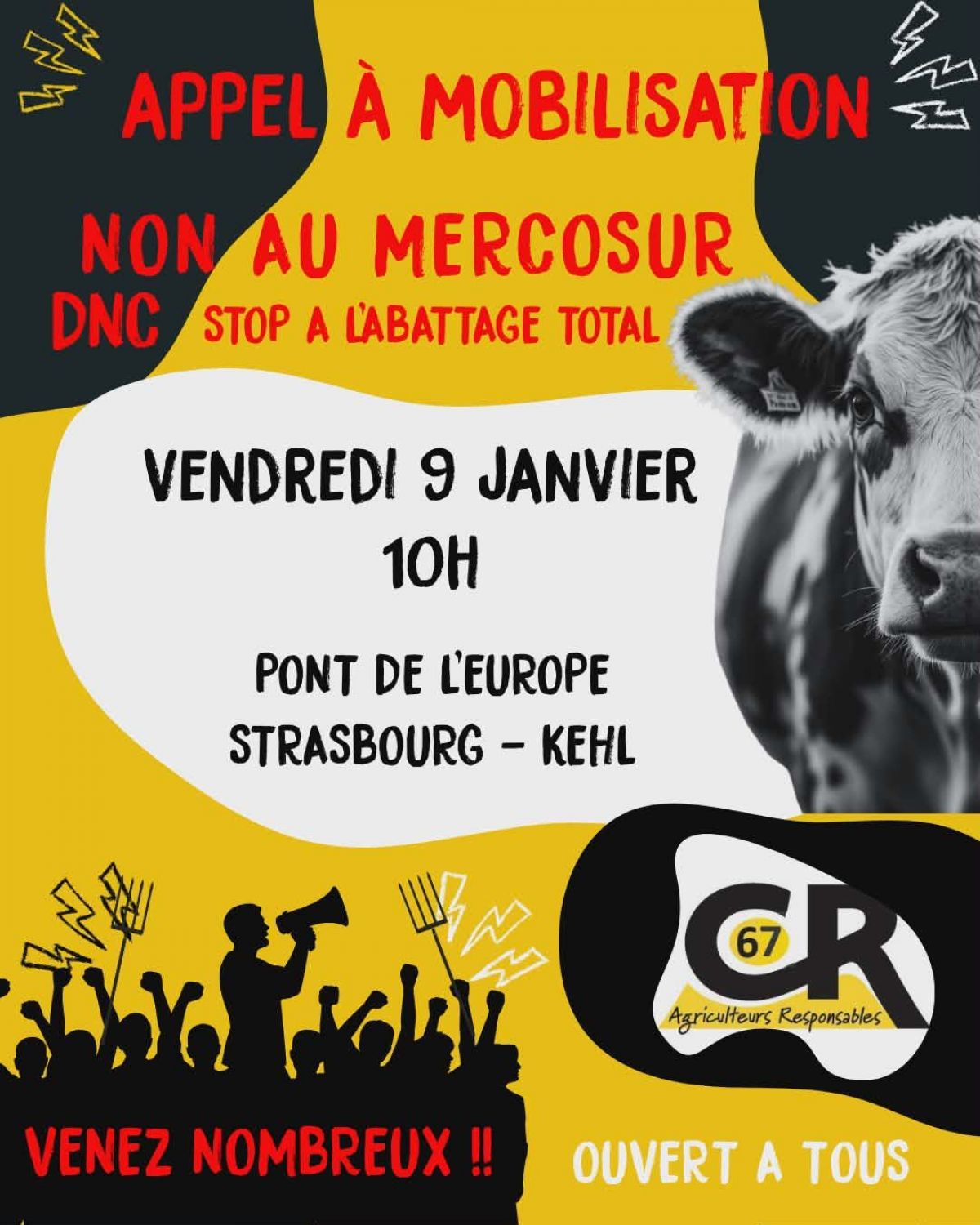À l’appel de la Coordination rurale, des tracteurs ont défilé dans les rues de Strasbourg avant de se rendre au pont qui relie la France et l’Allemagne. Les agriculteurs des deux pays ont réalisé une action de blocage pour dénoncer le traité de libre-échange qui vient d’être adopté. Les manifestants français dénoncent également l’abattage des animaux pour lutter contre la dermatose nodulaire contagieuse.