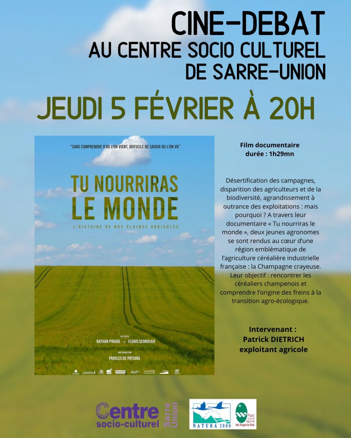 Le film « Tu nourriras le monde » sera diffusé à 20h ce jeudi 5 février. Il suit deux jeunes agronomes qui se sont rendus au cœur d’une région emblématique de l’agriculture céréalière industrielle : la Champagne crayeuse. Ils essayeront de comprendre leurs freins à la transition agroécologique.