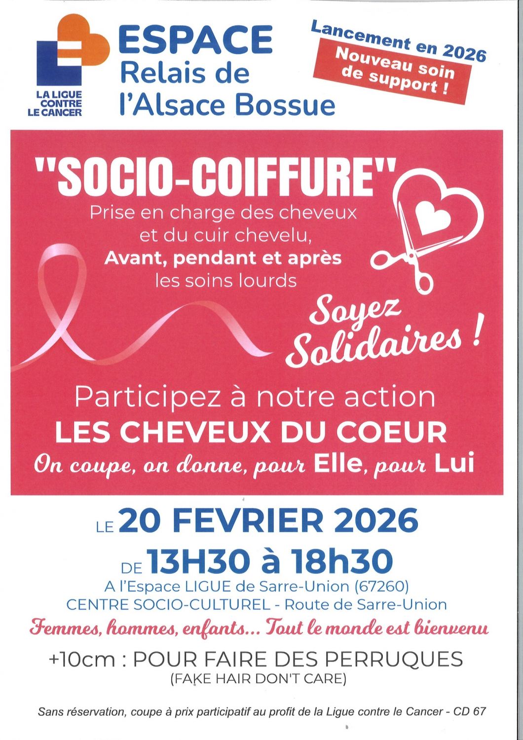 Le 20 février, une journée de don intitulée « les Cheveux du cœur » est organisée. Les personnes ayant au moins de 10cm de cheveux à couper peuvent venir faire un don. Vous pouvez vous inscrire auprès de l’Espace Ligue Relais situé à Sarre-Union.