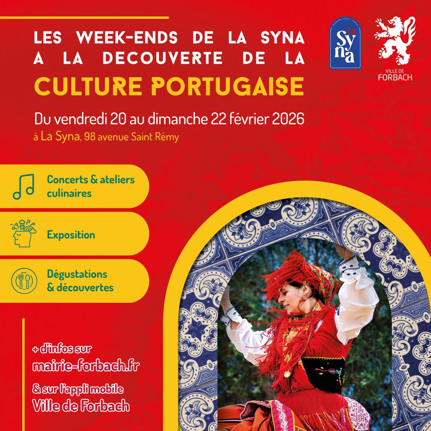 De vendredi soir à dimanche, la syna propose des ateliers musicaux et culinaires, des expositions et des dégustations autour du Portugal. Dans le détail il y aura des concerts de fado, une initiation à la danse folklorique portugaise, des ateliers de percussions ou encore un atelier cuisine autour de la soupe caldo verde et du bolo de bolacha.