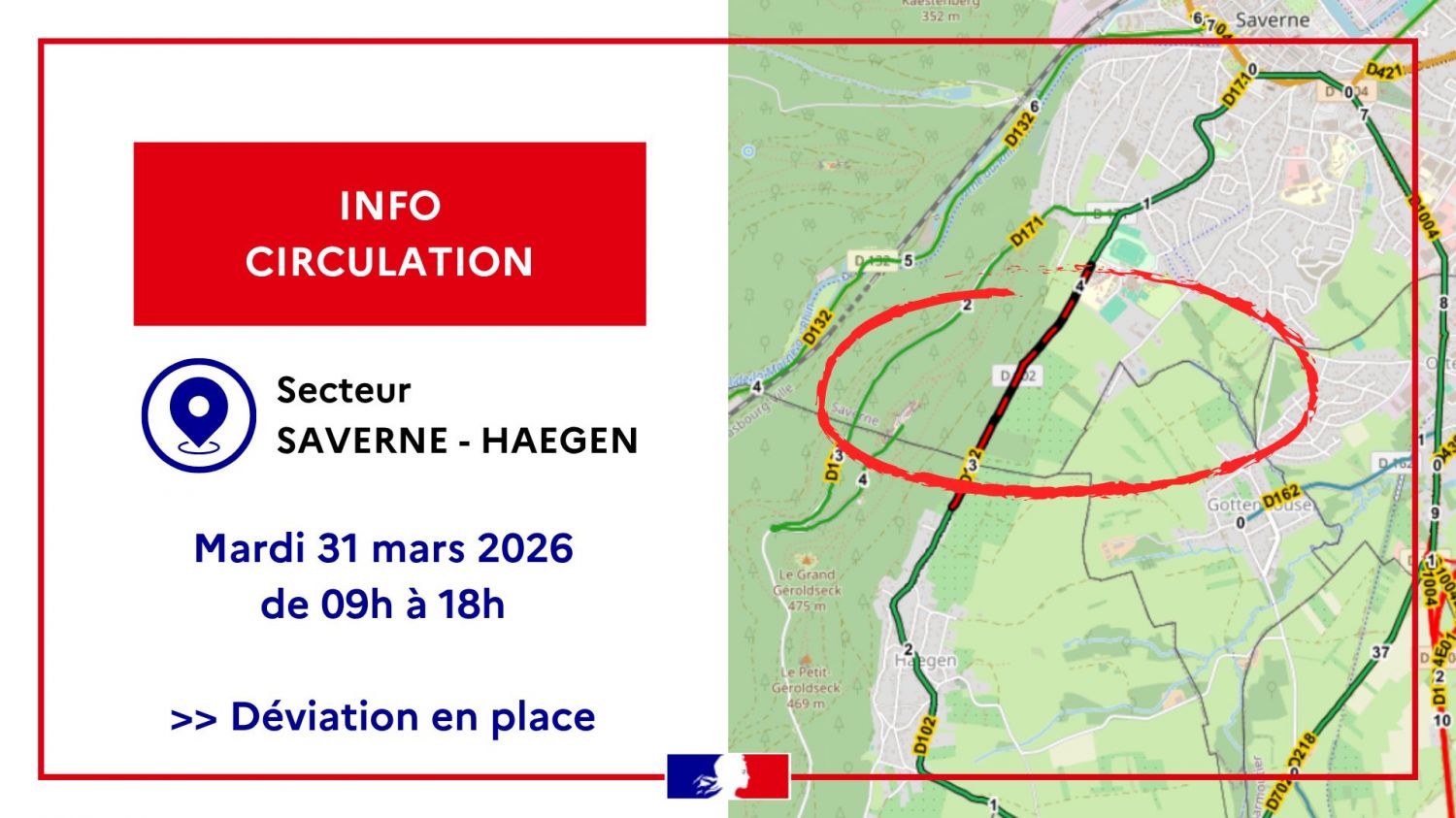 Mardi entre 9h et 18h un exercice de sécurité civile aura lieu dans le secteur de Saverne. Celui-ci entraînera la fermeture du tronçon entre Haegen et Saverne sur la D102.