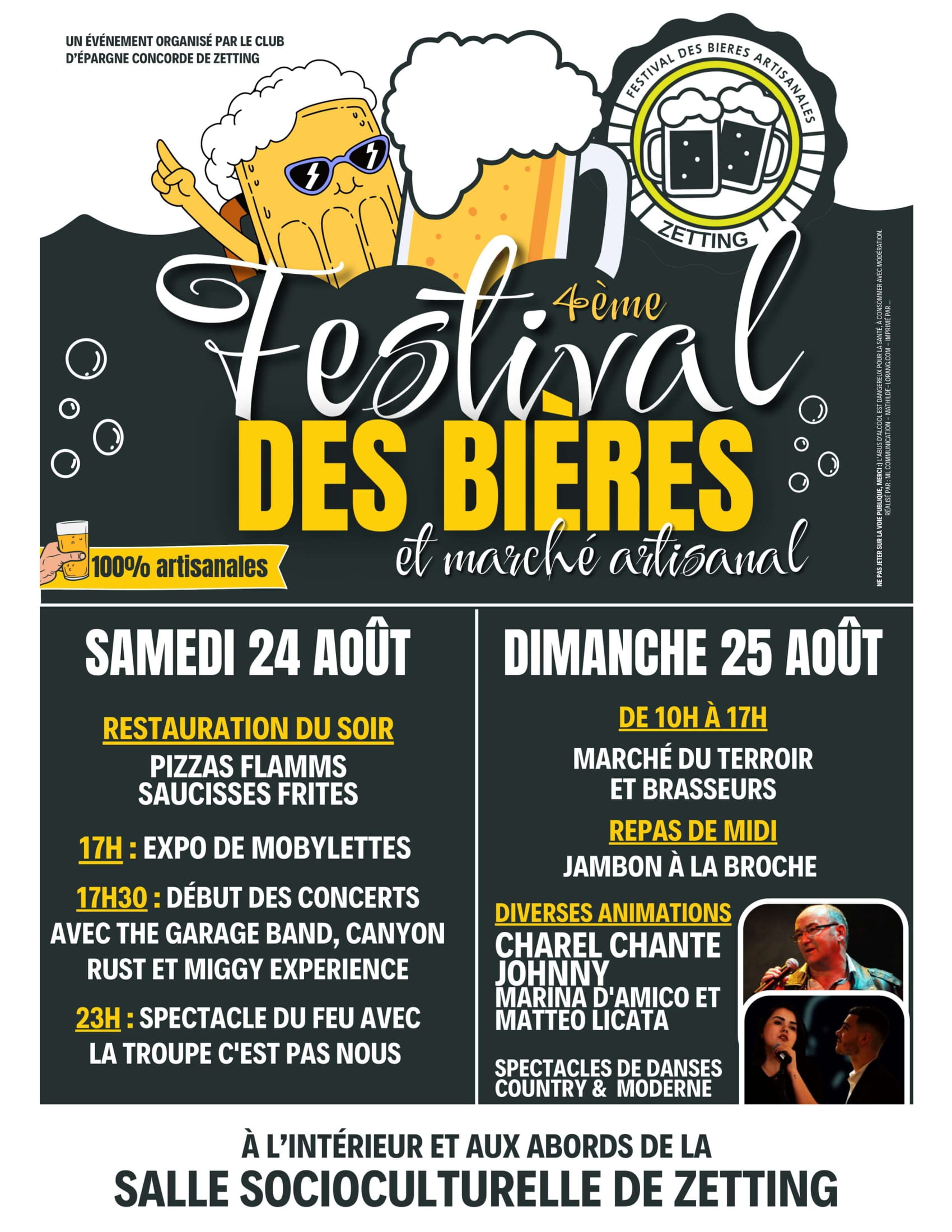 Le club d'épargne concorde de Zetting organise le festival des bières ainsi qu'un marché artisanal les 24 et 25 août 2024 à l'intérieur et aux abords de la salle socioculturelle de Zetting.