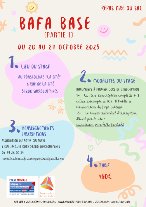 L’Association du Foyer Culturel en partenariat avec la FOL (Fédération des Œuvres Laïques de la Moselle) organise un stage BAFA BASE pendant les vacances de printemps 2025 à Sarreguemines.