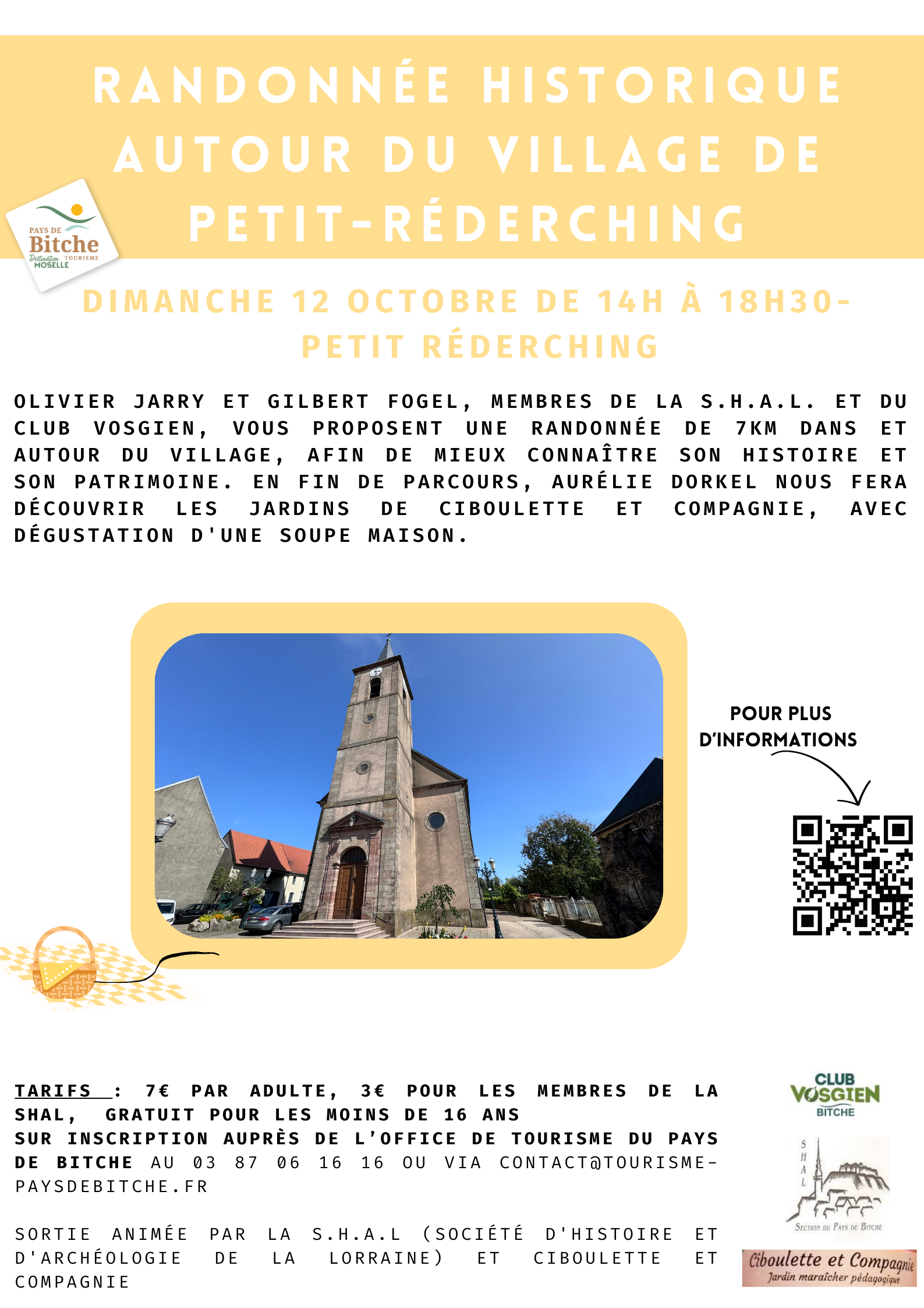 Olivier Jarry et Gilbert Fogel, membres de la S.H.A.L. et du Club vosgien, vous proposent une randonnée dans et autour du village, afin de mieux connaître son histoire et son patrimoine. En fin de parcours, Aurélie Dorkel nous fera découvrir les jardins de Ciboulette et compagnie, avec dégustation d'une soupe maison.