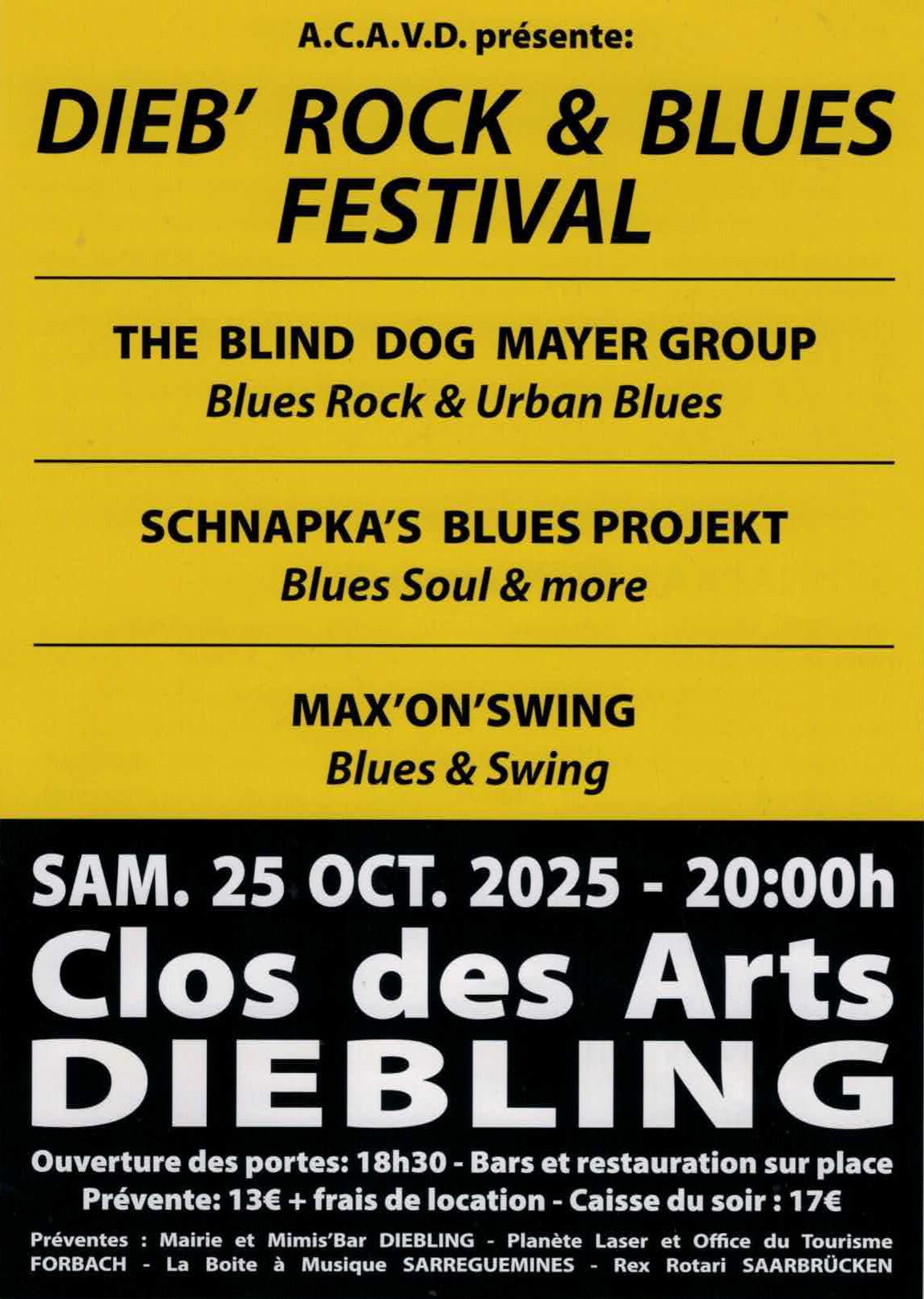 L'A.C.A.V.D présente : Dieb'Rock & Blues Festival le samedi 25 octobre à 20h au clos des Arts de Diebling avec sur scène :