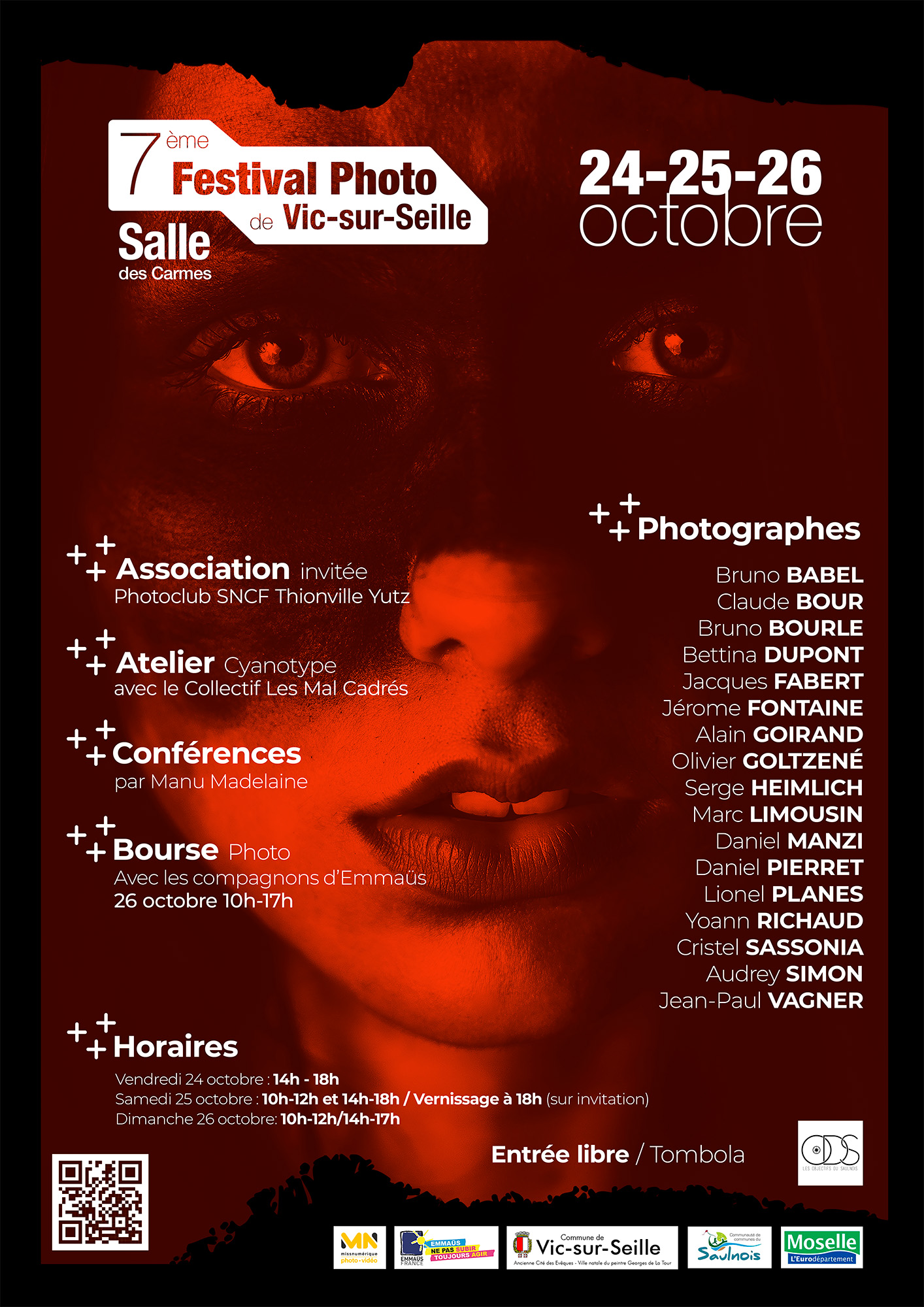 Évènement incontournable du Grand-Est le 7ème Festival Photographique de Vic-usr-Seille aura lieu les 24-25 et 26 octobre 2025 à la Salle des Carmes de Vic-sur-Seille. 17 Photographes, 2 conférences, un Atelier Cyanotype et une bourse photo seront au programme de cette exposition. L'entrée est gratuite et une tombola permettra aux visiteurs de remporter de très beaux lots en rapport avec la photo (tirages, bons d'achats en magasin photo, livres...)