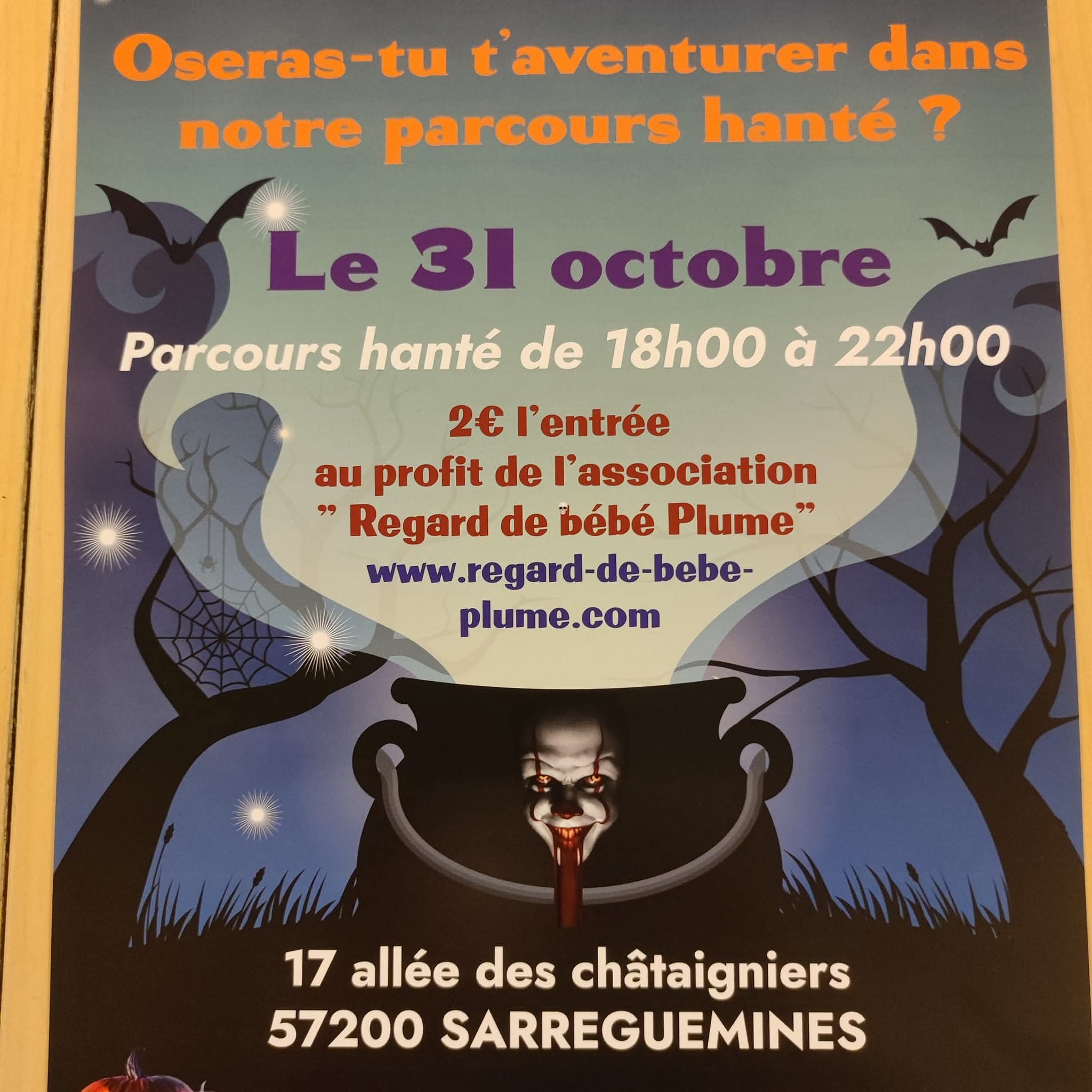 Un parcours Halloween à Sarreguemines en faveur d'une association www.regard-de-bebe-plume ..... Le 31 octobre de 18h à 22h.... Venez frissonner pour la bonne cause.....2€ l'entrée.